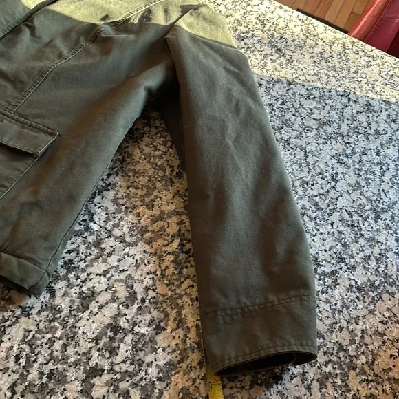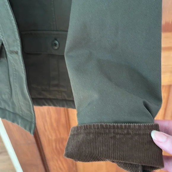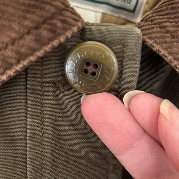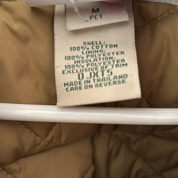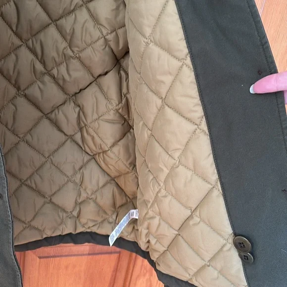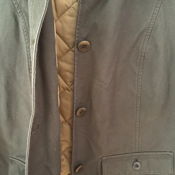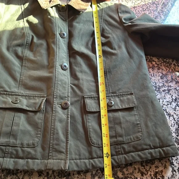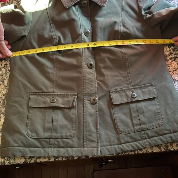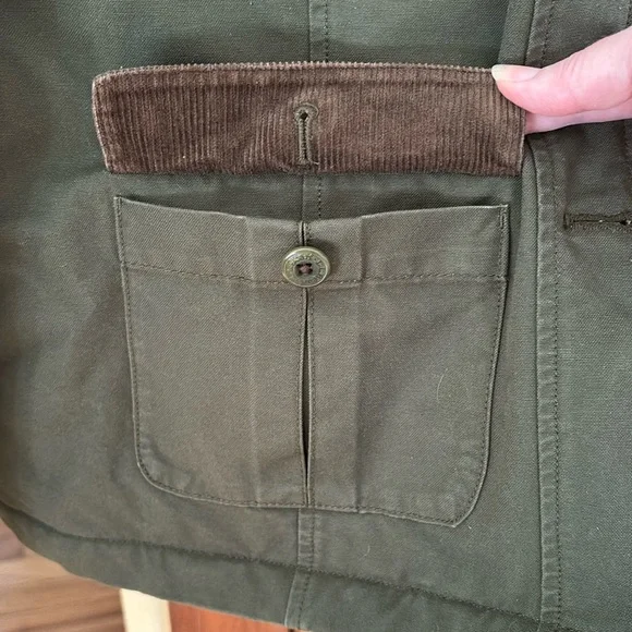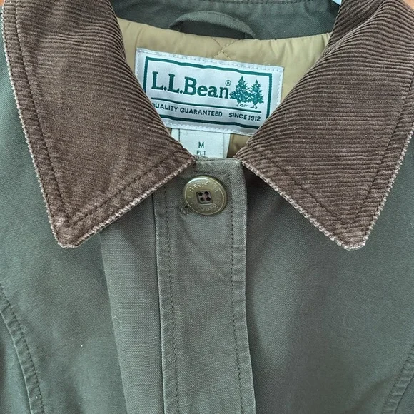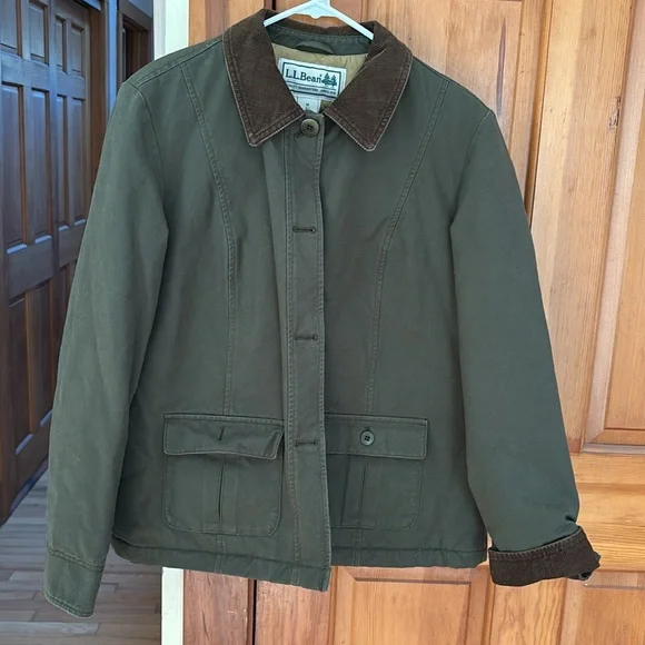 L.L. Bean Thinsulate Barn Coat aka field coat, chore coat, this is a thicker barn coat than the traditional one as it is Quilted inside with Thinsulate Insulation therefore costs more. This quality field coat, in Like New Condition. It’ll keep you warm yet protected you from the elements and remains very stylish for years due to the L..L. Bean quality.Color Army Green w/brown corduroy trim on collar and cuffs, sunny day when pics were taken as some pics reveal sun casting. Pic #2 is closest to true colorPetite MediumApproximate measurements: Ptp 22” length 25” sleeve from pit 17”100% cottonExcellent preowned condition
