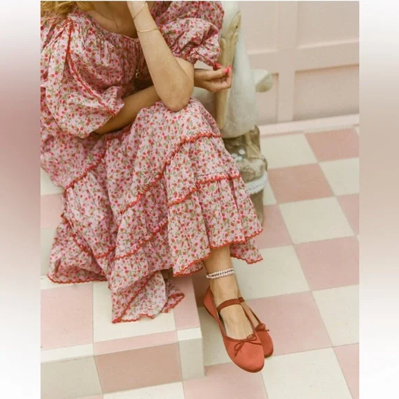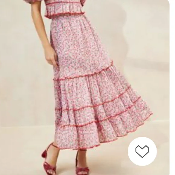 The Loeffler Randall Ellie Scalloped Hem MIDI Skirt in Strawberry Print is a stylish and trendy piece of women's clothing. this skirt features a flattering midi length with a scalloped hem, perfect for adding a touch of sophistication to any outfit. The vibrant red color adds a pop of color to your wardrobe, making it a versatile piece that can be dressed up or down for any occasion.Contents 100% cottonsMeasurements Waist:31”Length:37”B-2SMAnthropologie Free people Style