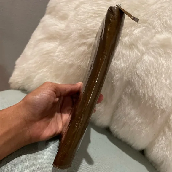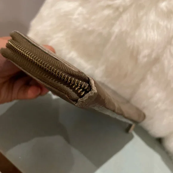 Deep olive green (almost looks brown), wear on edges and one corner has a bit of separation. Zipper works (has a bit of oxidation on zipper but only discoloration not dysfunctional!!) Slight separation on outer corner (does not go through like a hole). Really hard to telll unlesss you actually pull it up. Interior is beautiful!! 🤩