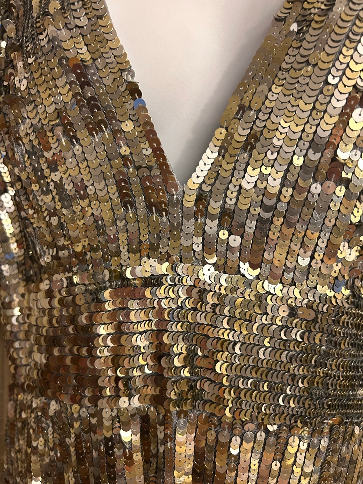 Mac Duggal Stand out- stunning sequin evening gown. Perfect for making a statement, this dress features a flattering V-neck and elegant silhouette.mostly silver - platinum but has also a gold hue! So gorgeous-with a nice empire waist and a little train in back - see first picture hard to see