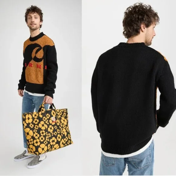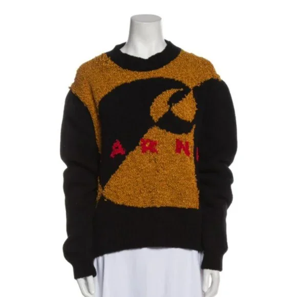 Fabric: Heavyweight knitChanille logo design at frontCrew neck and long sleevesRibbed trimShell: 95% virgin wool/5% silkGood pre-owned condition; there are pulled loops throughout the front, as shown. No structural flaws such as holes, etc.Size 50, equivalent to a Men's LargeArmpit: approx. 23"Length: approx. 24"See my closet for more great brands & save when bundling 2 or more items!