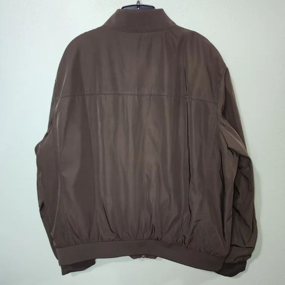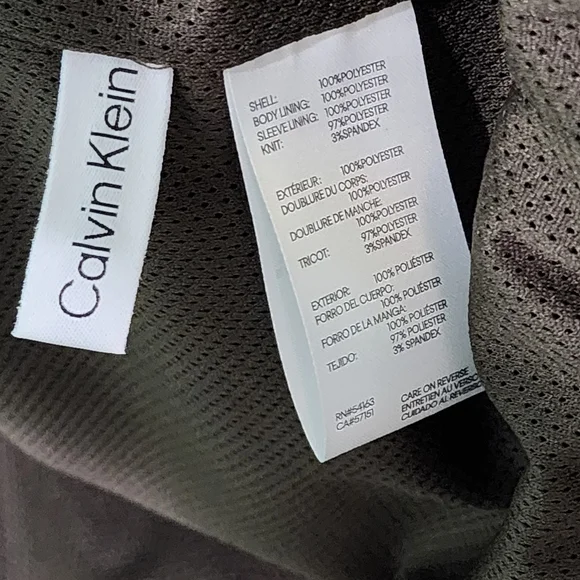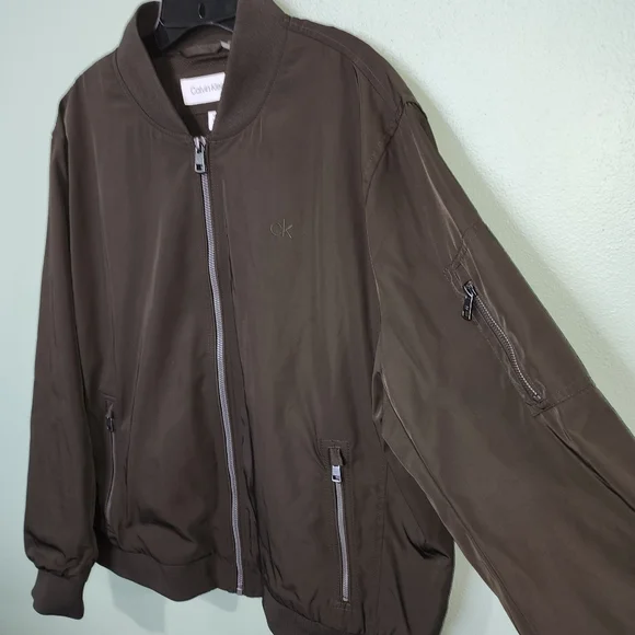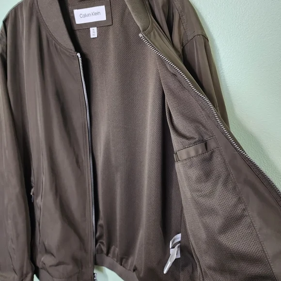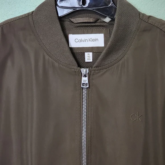 Men's Calvin Klein Bomber Jacket * Color: Olive green* Size: XL* Sits at waist* Medium Weight* Features: Zip-through stand collar, Zip-front closure, Two single entry hand pockets with zipper closure, Single chest welt pocket with zipper closure, Single pocket on arm with zipper closure, Interior single welt pocket, Cuffs with knit rib detail.* Materials: Shell, Body Lining, and Sleeve Lining: 100% polyester; Knit: 97% Polyester, 3% spandex* Machine washableThis bomber jacket by Calvin Klein is very nice and fashionable! Excellent condition!