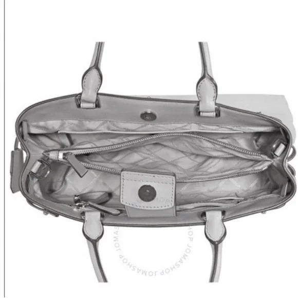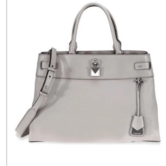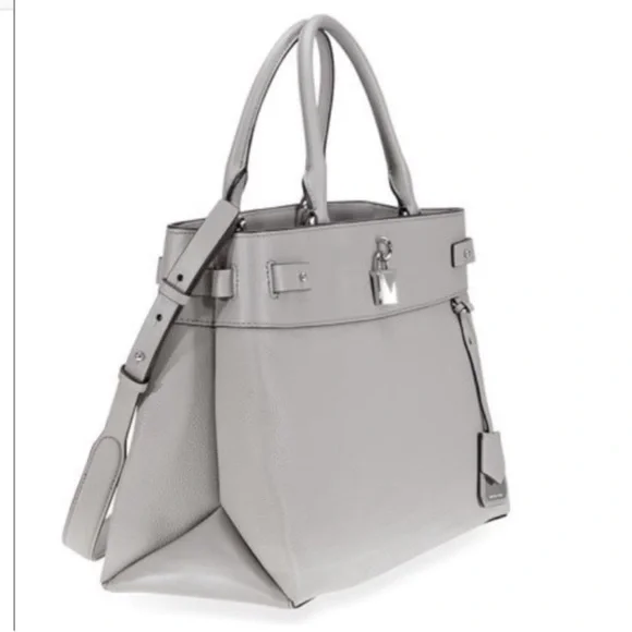Michael Kors Gramercy Large pebbled leather satchel Pearl greyBrand new with tags A Michael Kors satchel from the Gramercy collection crafted in pebbled leather with 100% polyester lining, and silver-tone hardware. This Michael Kors satchel features 2 main compartments, 1 center zip compartment, 6 front slip pockets, 2 slip pockets, wall zip pocket, wall slip pocket, and an adjustable/removable shoulder strap with a 17"-19.5" drop. Dimensions: 14.5"W x 10"H x 6"D.