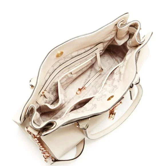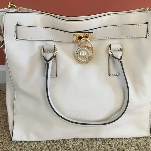 Michael Kors Hamilton Large Vanilla Tote100% Original.Brand new & unused. In mint condition.Always stored in dust bag in closet.Size: LargeColor: VanillaMeasurements approximately:L 14" X H 12" X W 5"DETAILS- Pebbled Leather Exterior, Stands on it's own- Magnetic Snap Tab Top Closure- Wide Leather and Chain Shoulder or Cross Body Strap- Gold Hardware Lock with MK Logo + Key- Completely Lined in MK Logo Satin Interior- Zipper Pocket + Four Interior Slip Pockets- Key ring strap- Dust bag