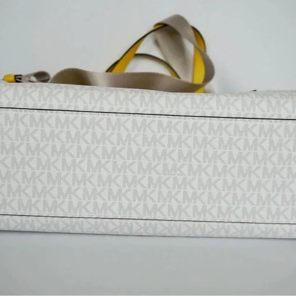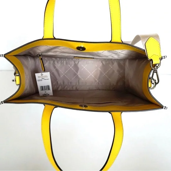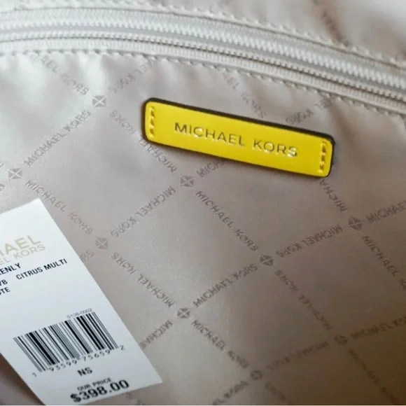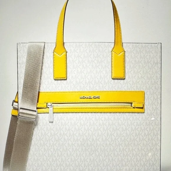 Made of PVC with leather trimMagnetic snap closure Back wall zip pocket and 2 slip pockets01 large front Zip pocketBrand-name leather and metal charm detail on frontAdjustable, detachable Canvas shoulder strap with 18"-20" drop Double Flat leather handles with 4" dropSize: 14.25" WX 13.25"H X 5.25"DGold or silverhardware.Model: KENLY