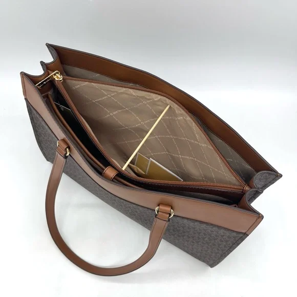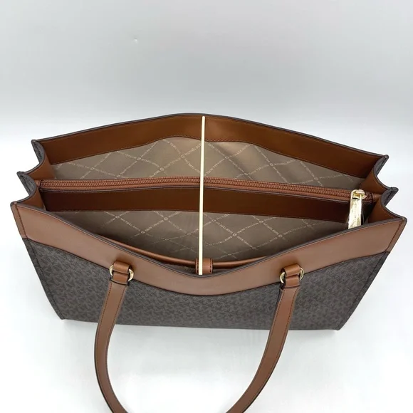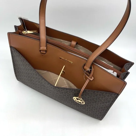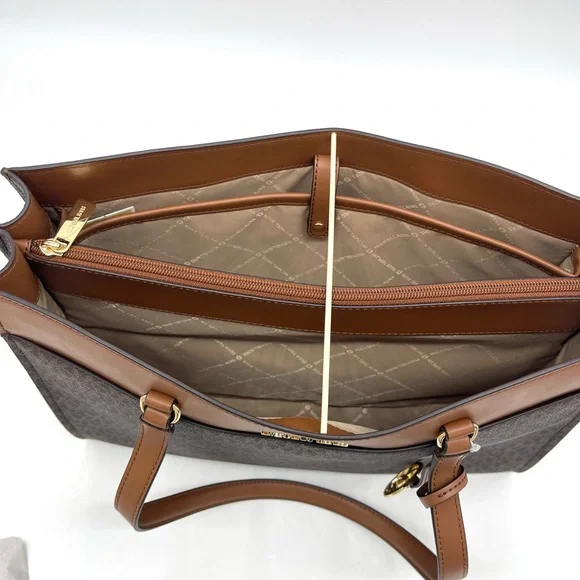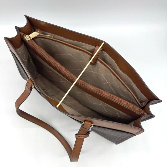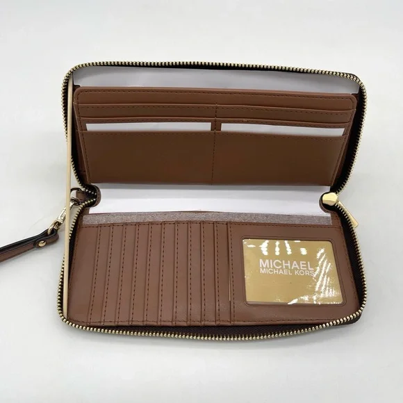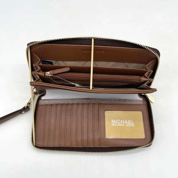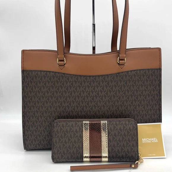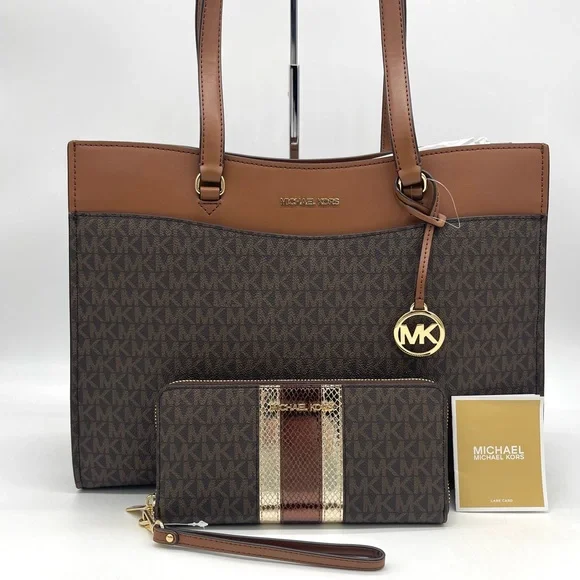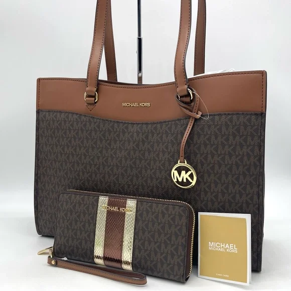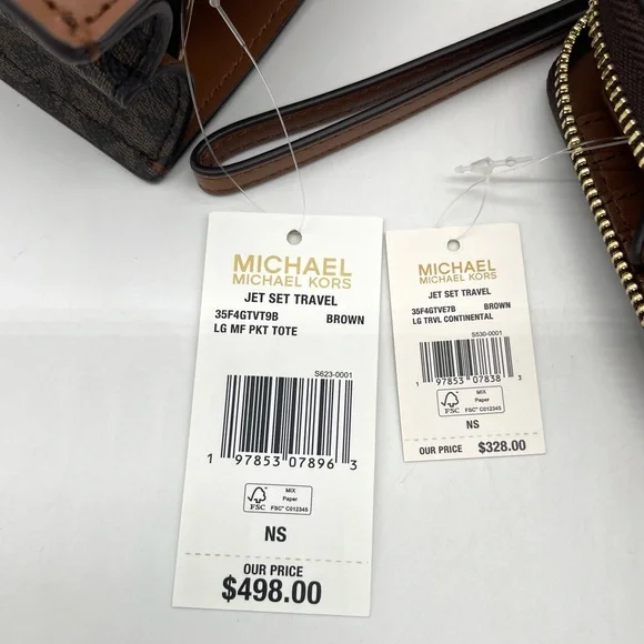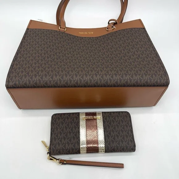 Brand New with TagMichael Kors Large MF Pocket Shoulder Tote BagColor: Signature Brown• Gold-tone hardware• 15"W × 11"H x 5"D• Handle drop: 10"• Interior details: middle big zip packet, side pocket for computer• Lining: 100% polyester• Exterior details: Front pocket• ImportedJet Set Travel Large Travel Continental LeatherColor: Signature BrownGold tone hardwareZip around style with iconic logo on the frontInterior features16 card slipsID windowzippered pocket and multiple full length bill compartmentsRemovable leather wristlet strap with swivel clasp and a drop of 6 inches8.25" (L) × 4" (H) × 1.25" (W) with a removable wristlet strap