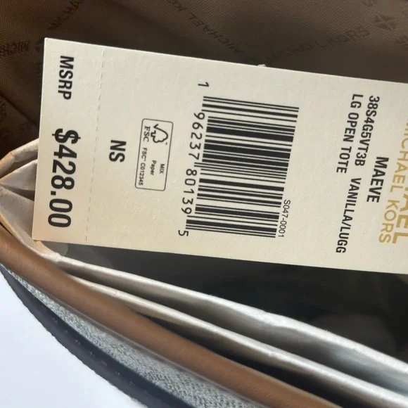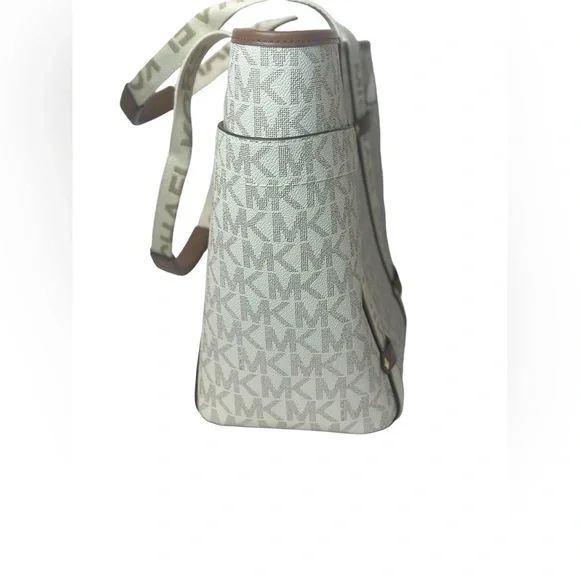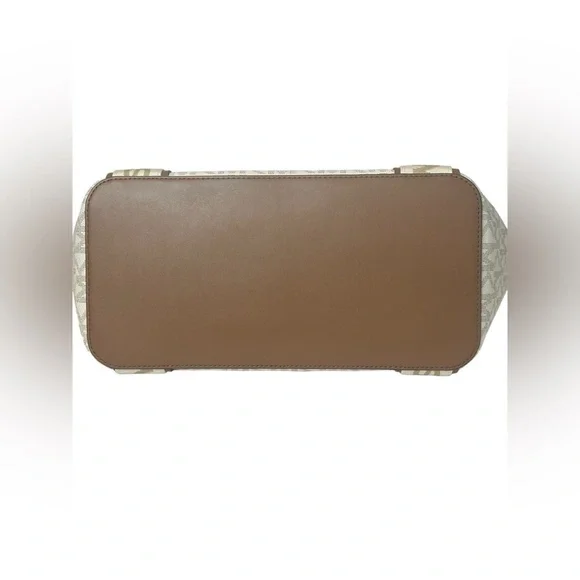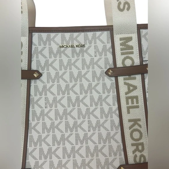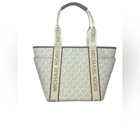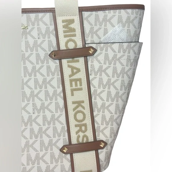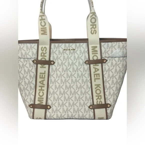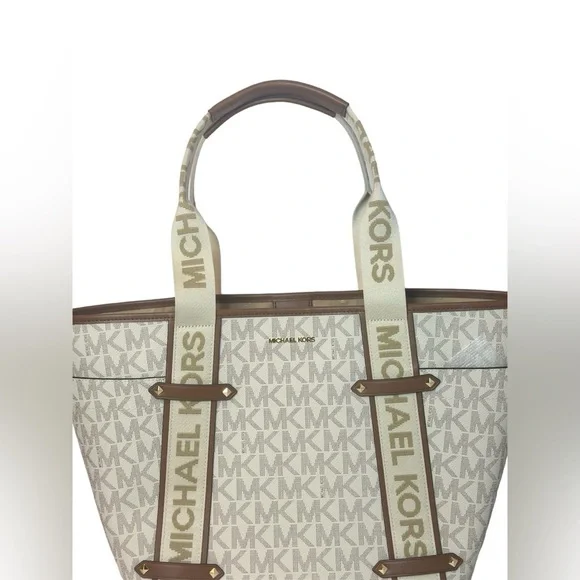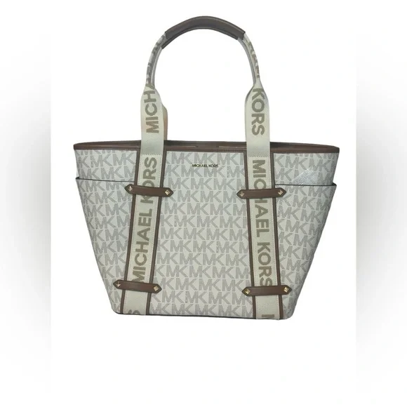This Michael Kors Maeve tote is the perfect addition to any wardrobe. With a spacious interior and multiple pockets, it's both practical and stylish. The exterior is made of durable canvas and leather, with a pebbled finish and applique accents. The gold-plated hardware adds a touch of luxury, while the double handles make it easy to carry. This tote is the ideal accessory for any woman on the go.
