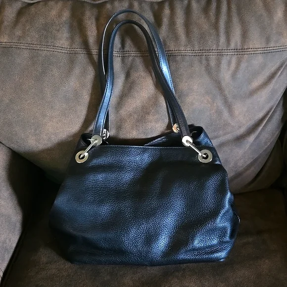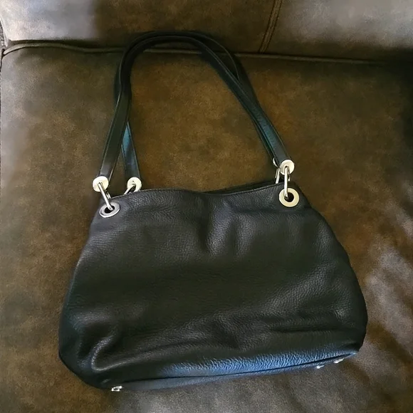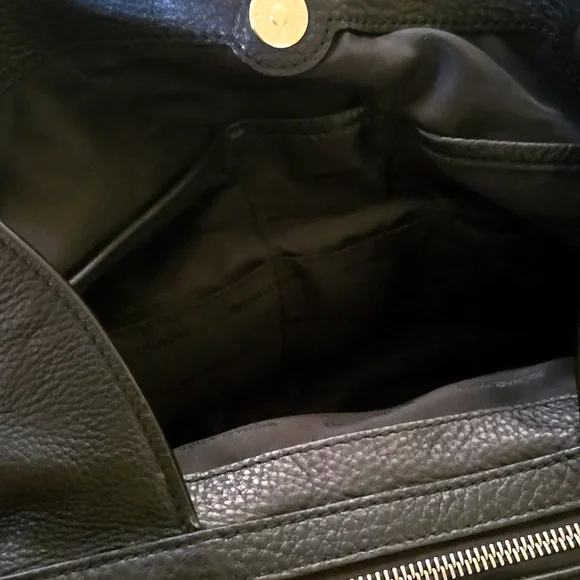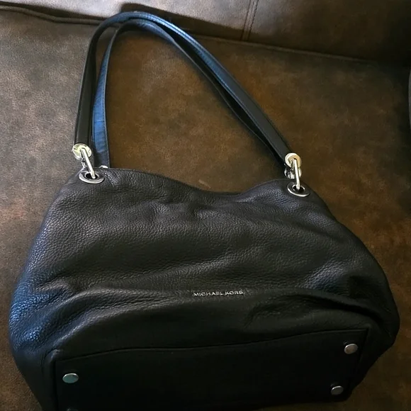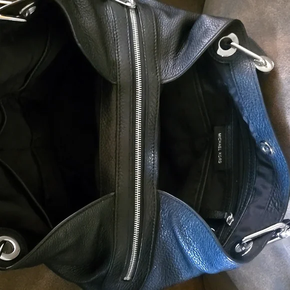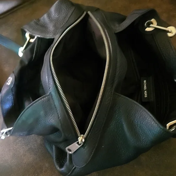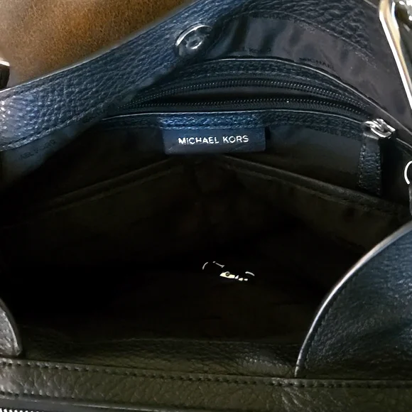 Michael Kors Multi Pocket Black Hobo Bag. Very spacious interior with a zippered pouch and 2 open pouches. One Side has a zippered pocket either 2 open pockets and the other side has 6 open pockets. The handles and bag are in great condition. The feet have a little discoloration that's on the bottom of the bag and barely noticeable.