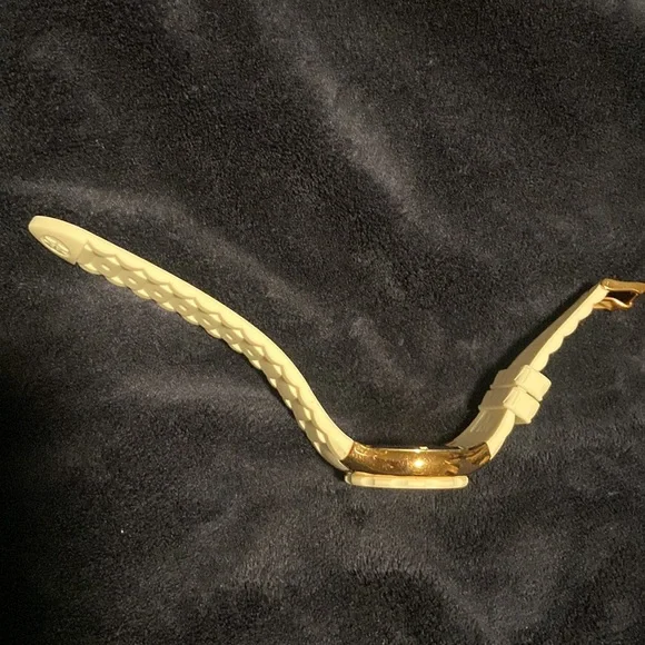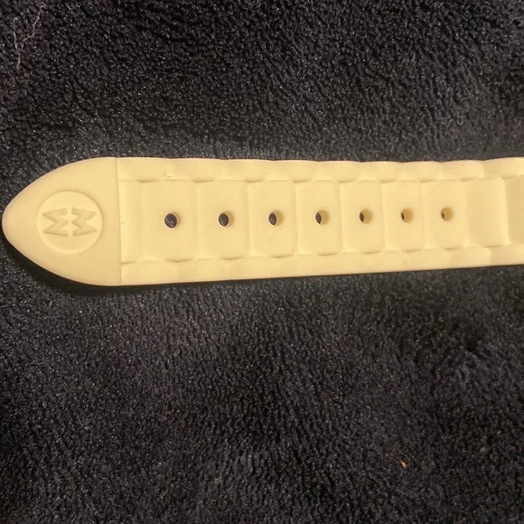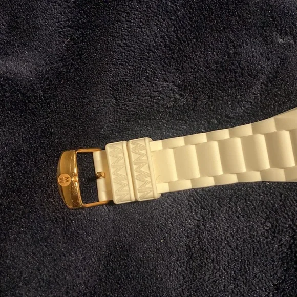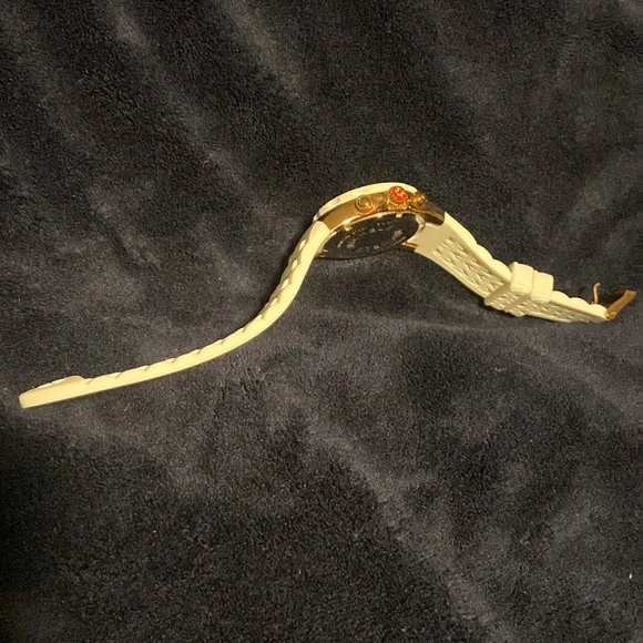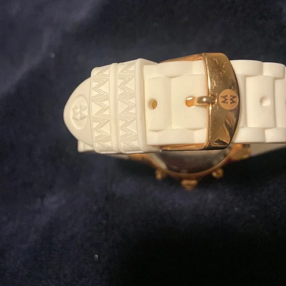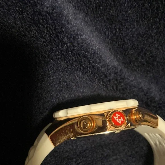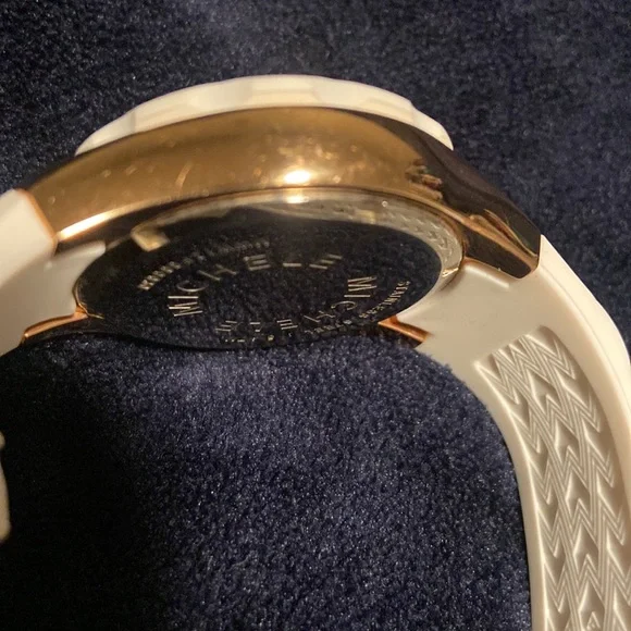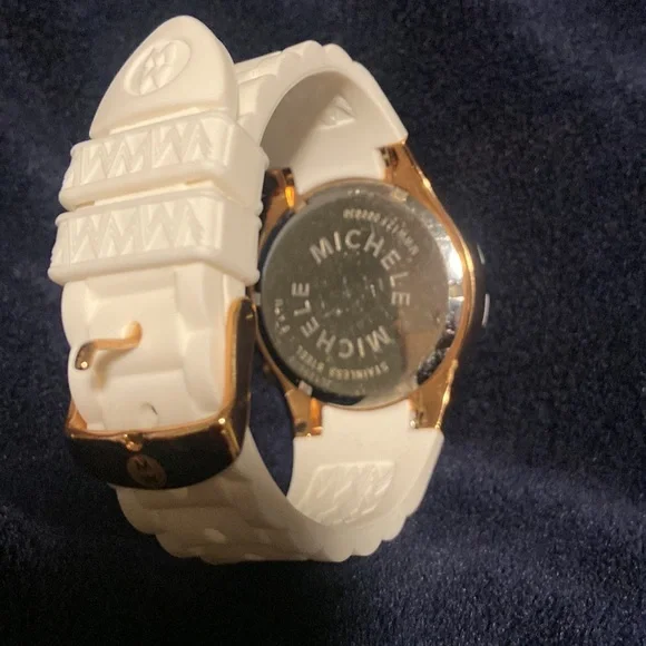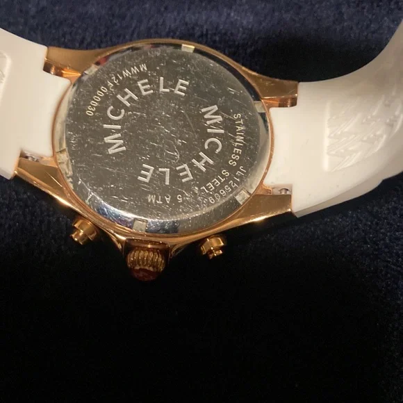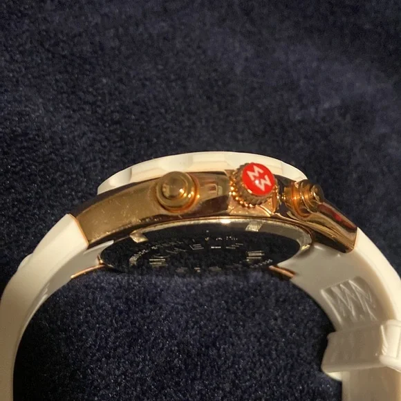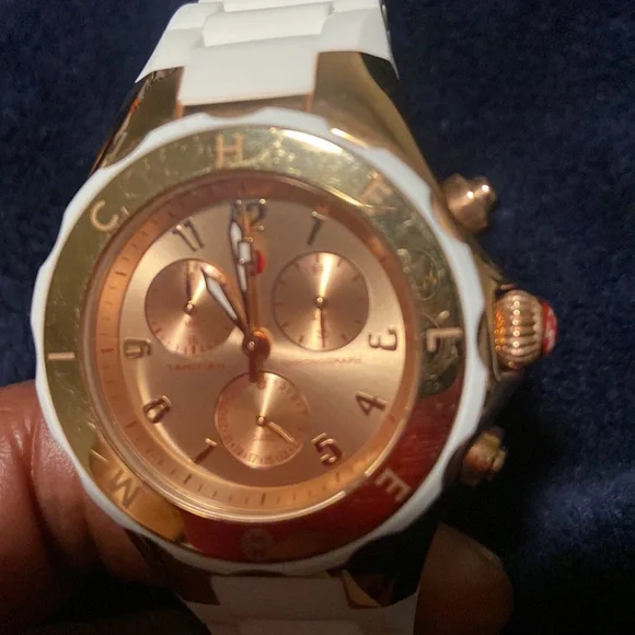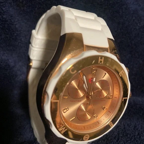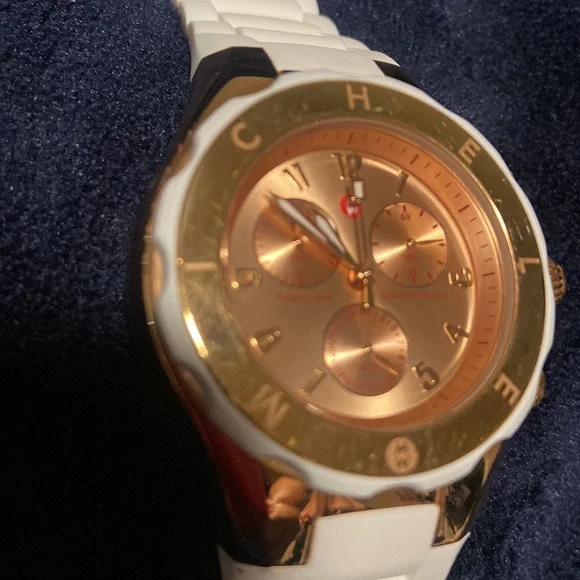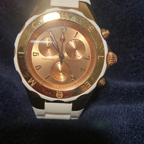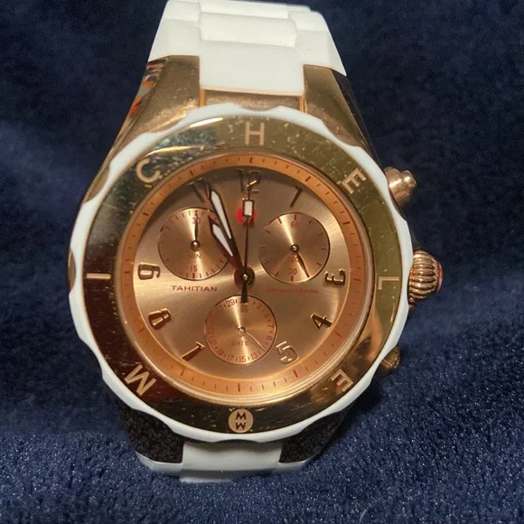 Michele Tahitian jelly beans chronograph rose gold tone stainless steel case with white silicone rubber strap gold tone bezel rose dial with luminous rose hands and Arabic numeral hour markers quartz movement 40mm case water resistant pre-owned great condition like new no scratches running