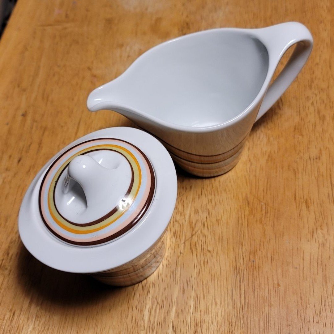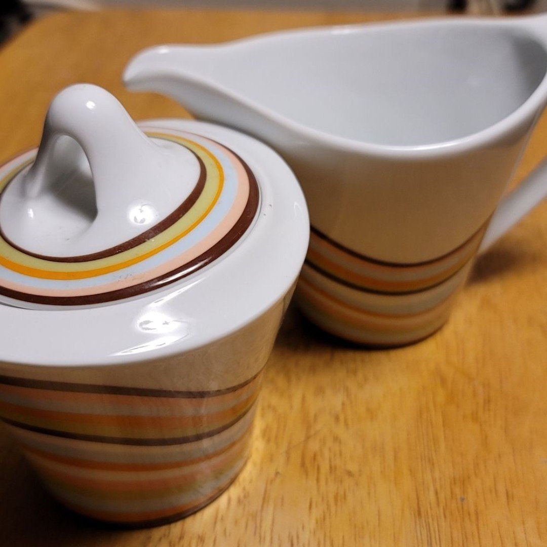Mikasa Buenos Aires Creamer and Sugar Set. This beautiful flowing pattern in blue, orange, brown, green, pink, and white. There is a chip on the inside lid, shown in pics. Does not affect look or function.