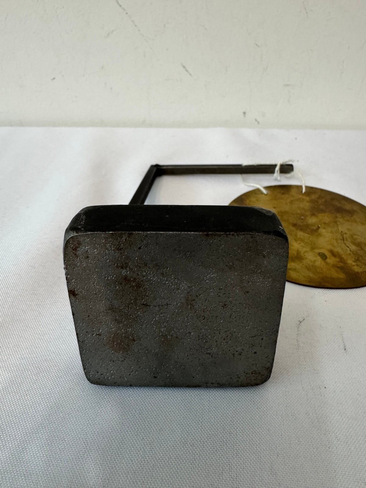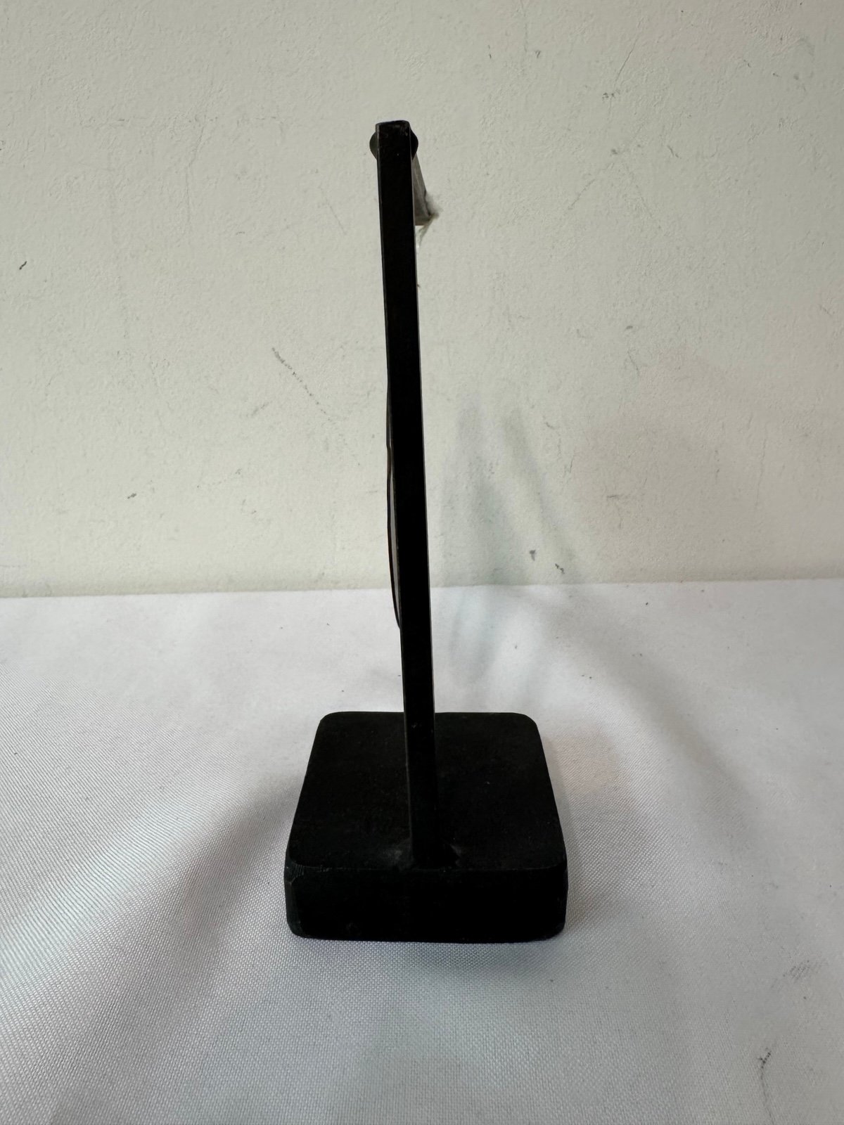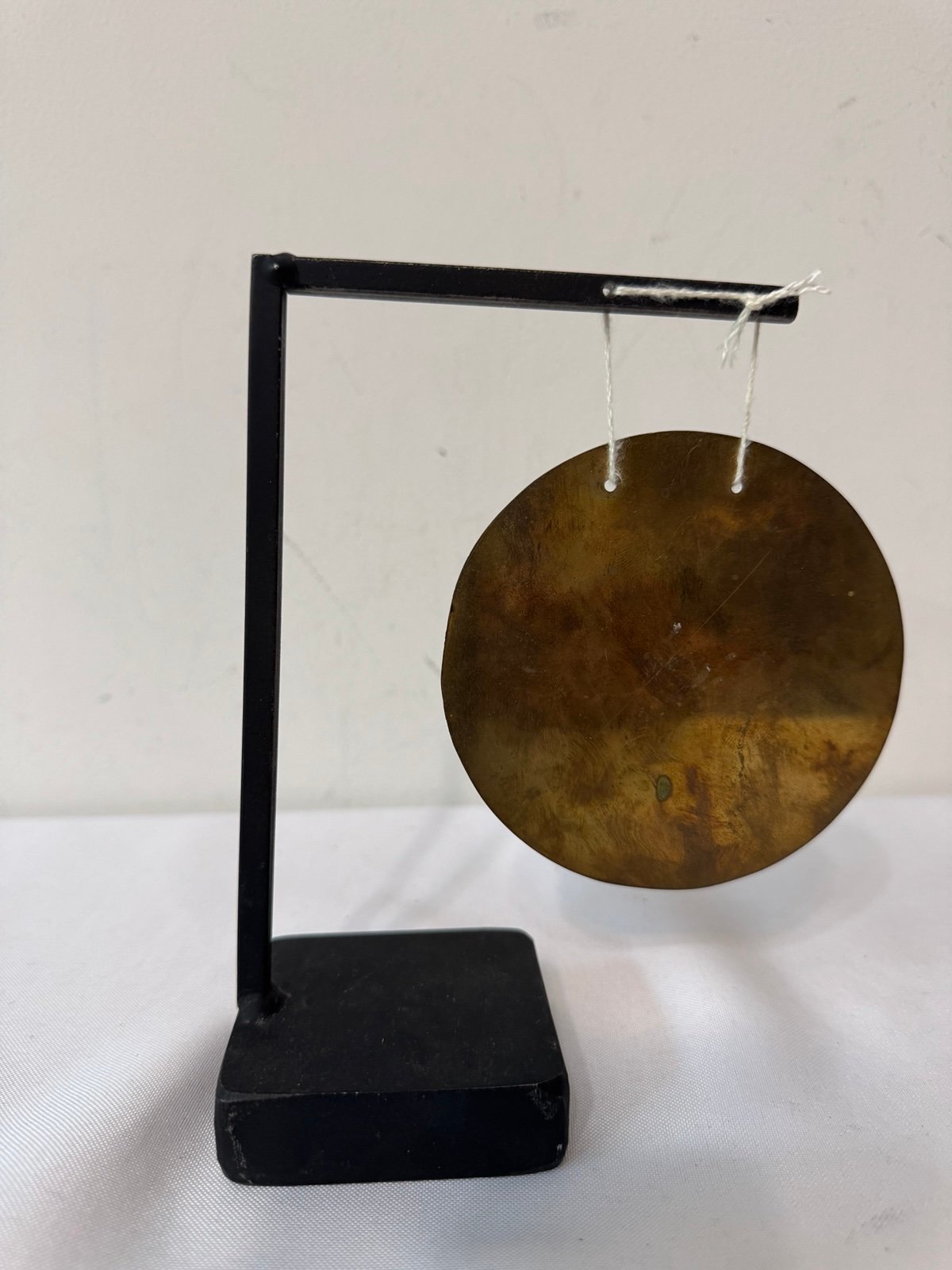 Wonderful calming sound, this mini gong is brass and the stand is stacked metal plates. I do not know more about it, as this particular gong with stand is not found on internet. So I'm just throwing out a price from other gongs I've found.