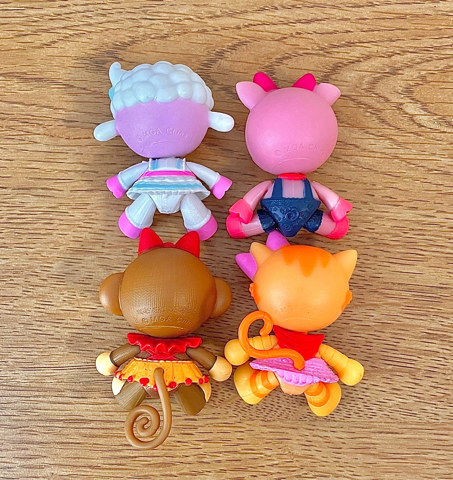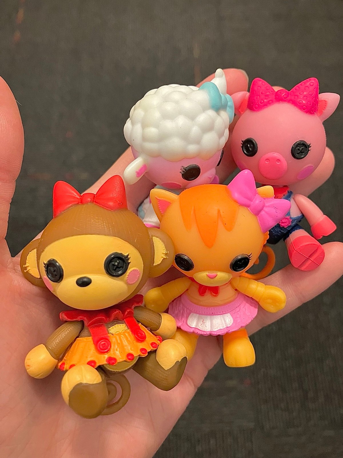 Excellent condition 3 inch Mini Lalaloopsy Wooly Fuzzy Fleece, Purrty Kitten Paws, Tickles B. Nana, Belly Curly Tail dolls.