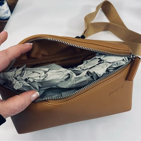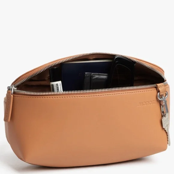Crafted with water-resistant, ultra-microfibre vegan leather, the compact and functional Metro Sling is a crossbody bag made for life on the go. Thoughtful interior pockets keep your everyday essentials organized and close at hand, while an integrated keychain carabiner makes lost keys a thing of the past. A hidden, full-length back pocket keeps your wallet, phone, or passport secure yet accessible. And with the versatile single-strap design, the Metro Sling can be worn across your body or slung over one shoulder – a truly multimodal bag for all the ways you move through your day.The vegan leather finish is made with ultra-microfibre vegan leatherBoth the nylon and vegan leather finishes are water and scratch-resistantSpacious zippered main compartment with one interior zip pocket and three sleeve pocketsIntegrated keychain carabiner for keys and fobsHidden, full-length zip pocket on the back for phone, passport, wallet, or small valuablesAdjustable strapAnti-catch zipperExterior measurements: 10.24" × 5.51" × 1.97"Length with fully extended strap: 61.5"Weight: 0.75 lb (nylon version) / 0.88 lb (vegan leather version)*** Color is IDENTICAL to cover photos, lighting in photography does change the color slightly on additional photos***#FannyPack #BeltBag #VeganLeather #Professional #Travel #Easy #Effortless #Office #Executive #Preppy #Vacation