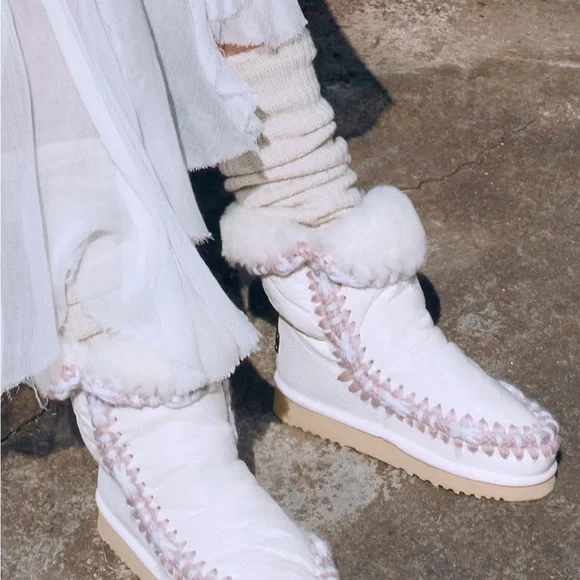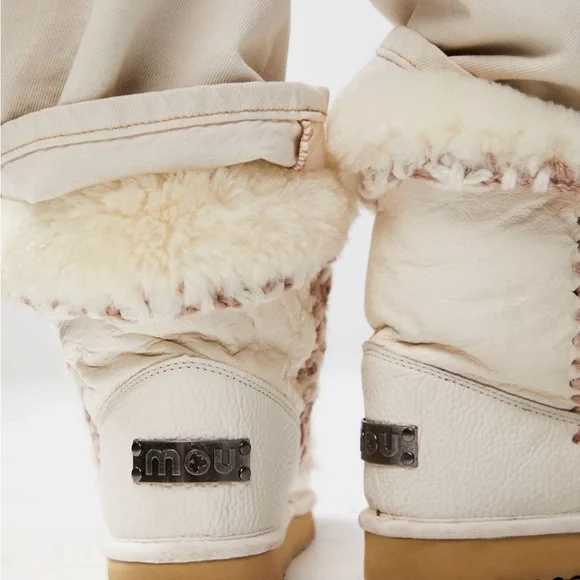 Style No. 83897421; Color Code: 010Color: Waxi White Size: US 6 EU 37You’re the coziest in these handmade, sherpa-lined boots from MOU, featured in a chunky style with 3D wool overstitching for an extra dose of detail.Features: Mid-calf length, hand-crafted, leather uppers, round toe, trademark hand-crocheted wool stitching, supportive heel counter, EVA midsole, rubber outdoor sole