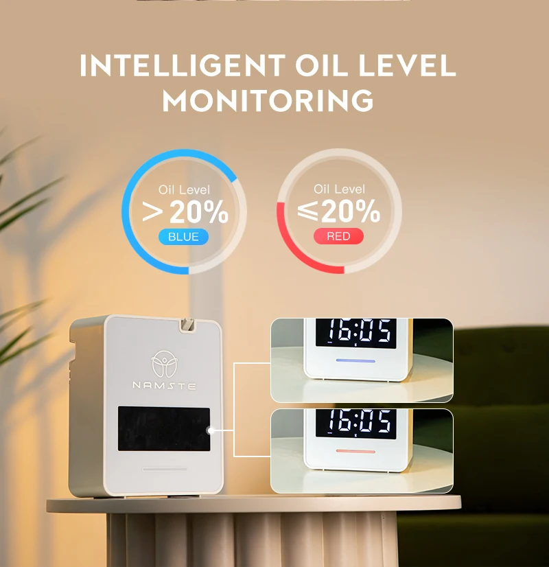 【Elegant and Durable】 Using acrylic panels and high-quality PP materials, it has an elegant design and low noise. The large display screen allows you to easily observe the status of the machine, and it can also be used as a clock while enjoying the fragrance.
