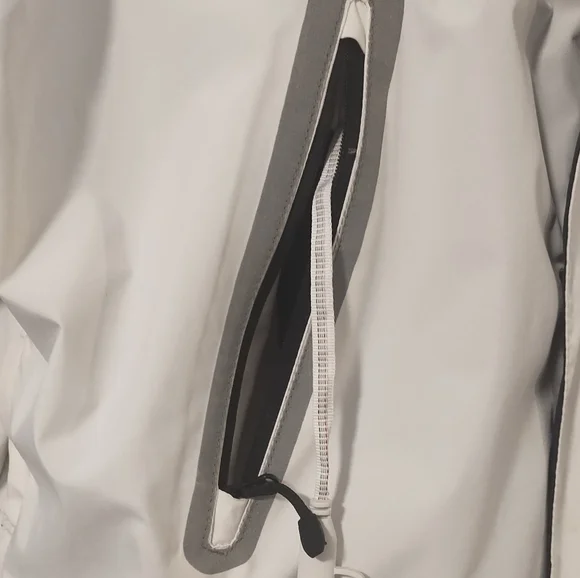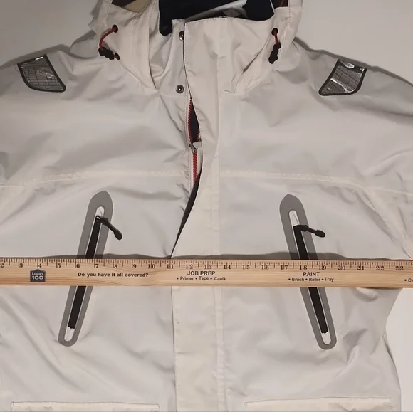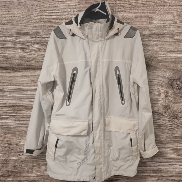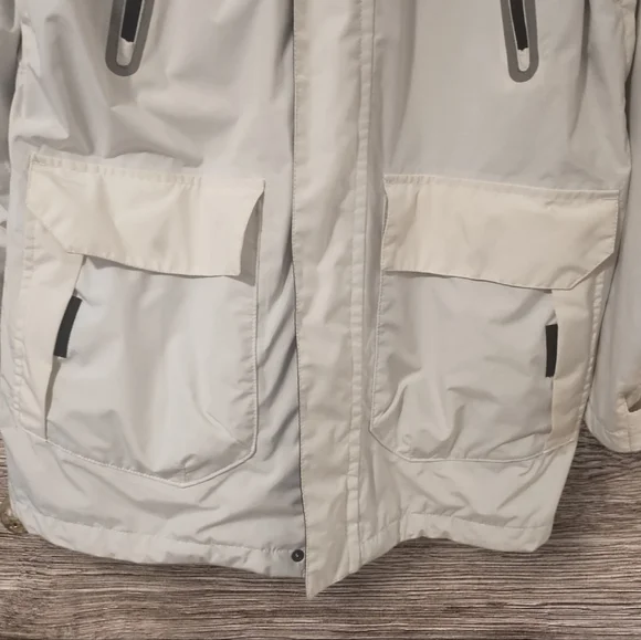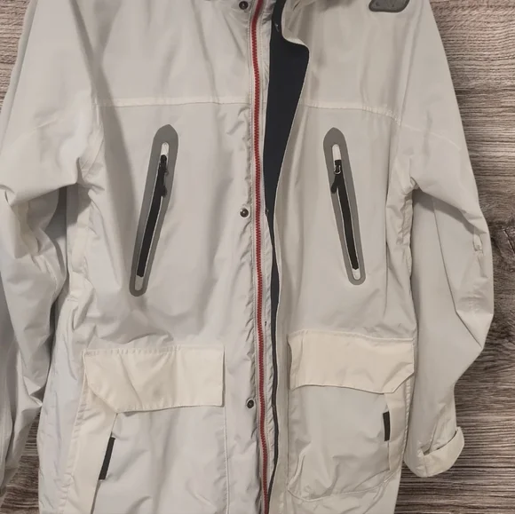 • NAUTICA Men's 30th Anniversary Sea Wall Parka• In excellent preloved condition• Size: Large• Retail Price: $298.00• Lightweight white anorak for land or sea• Zip and Button Closure• Has some wear - may come out in the wash - See Pictures• Has inside pocket with hole to run headphones• Has a built in micro cable• 2 Slanted Front Zippered Chest Pockets • 2 Flap Pockets - Front Bottom Left & Right with Velcro Side Pockets on Top• Underarm Zipper to Open Vents• Shoulder Tops have Silver Reflector Patches• Hood has 2 Smokey Clear Panels Along the Front to Look Out Of When Hood is Closed Around Face• Length: 23.5”(approx) (bottom of collar straight down the middle)• Pit to Pit: 24” (approx)• Shell: 100% Polyester• Body Lining: 100% Nylon• Sleeve Lining: 100% Nylon• Pocketing: 100% Nylon** Notes:• All items are carefully examined, measured, photographed, and described to the best of our ability.• Manual measurement: Please allow minimal errors on size.• The color may be slightly different due to different screen displays.• Comes from a smoke-free pet free environment
