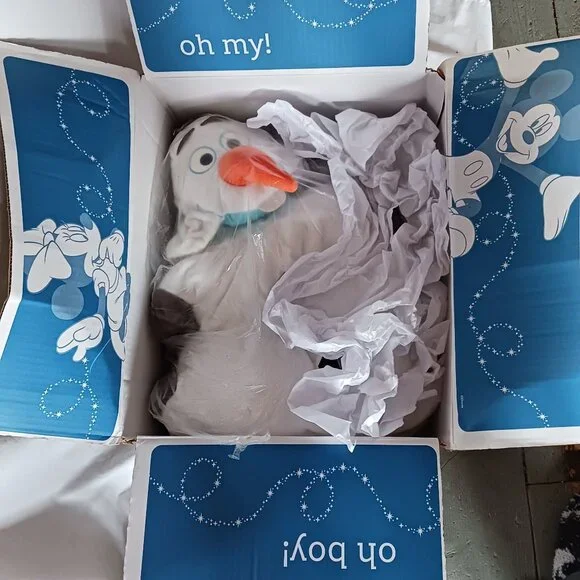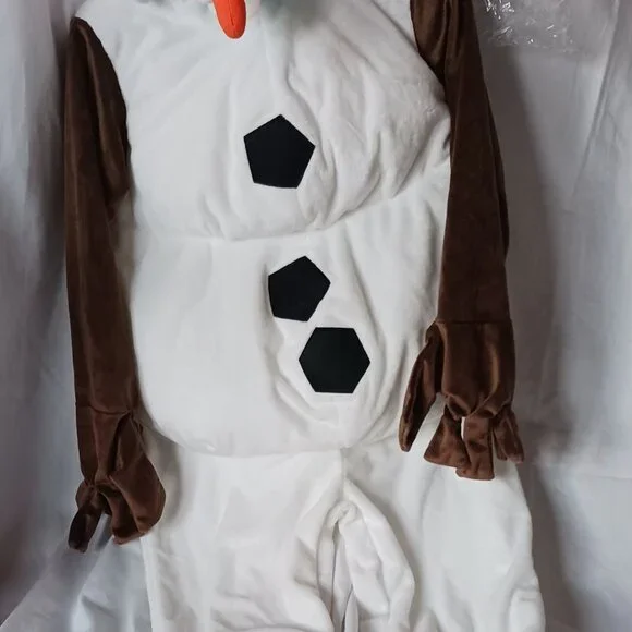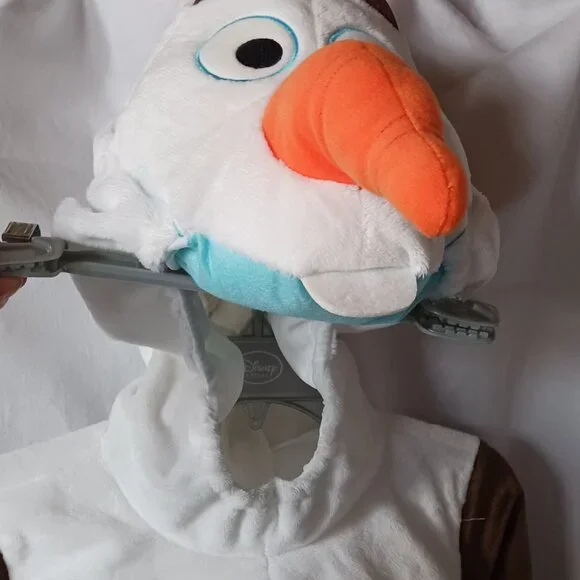 NEW Disney Store Authentic Stuffed Plush Frozen Snowman OLAF costumeChild size 5/6New with tagsAuthentic Disney costumeSoft plush one-piece outfitZip back closureEmbroidered featuresPlush, fabric, felt, and foam appliqué detailingElastic trim hoodAttached padded gloves with opening at wrist so hands can slip freeAttached shoe covers with elastic strap