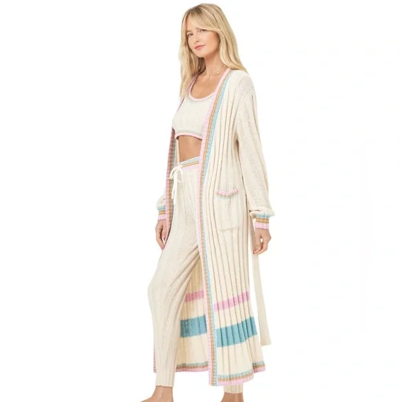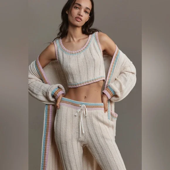 Brand new with tags! You'll be super cozy in the Ivy Duster. This ankle-length sweater will have you wrapped in warmth thanks to its self tie waist, ribbing at the cuff and neckline and a colorblock hem. Pair it with the matching joggers and tank for a pulled together lounge look.Ankle Length DusterSelf Tie WaistRib At Cuff and NecklineColorblock HemSize XS/S68% Cotton, 32% NylonThe Ivy Top is our new sweater knit crop top. It has tank sleeves and a colorblock hem. Pair it with the matching joggers and duster for a pulled together lounge look.Crop TopTankColorblock HemSize SWhether you are running errands or bingeing your favorite show, the Ivy Joggers are the perfect pants for you. These comfy little guys feature a color block hem, pockets, ribbed ankle cuffs and a tie waist. Pair them with the matching duster and tank for a pulled together lounge look.High WaistColorblock HemRibbed Ankle CuffsTie at WaistSize S