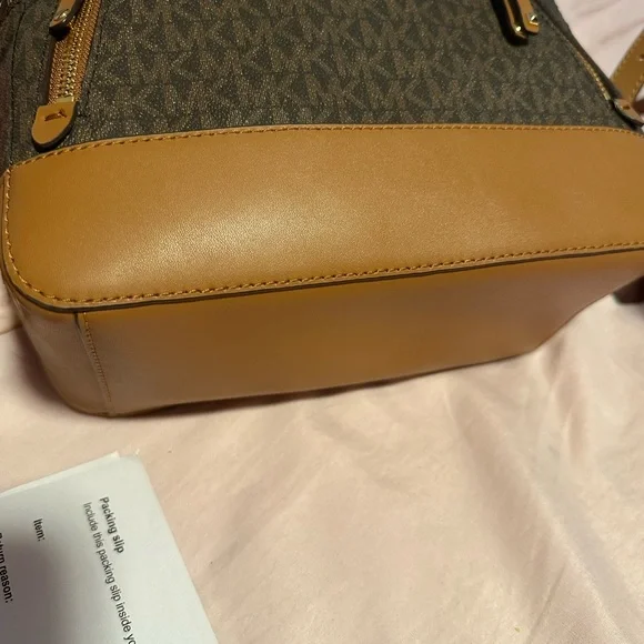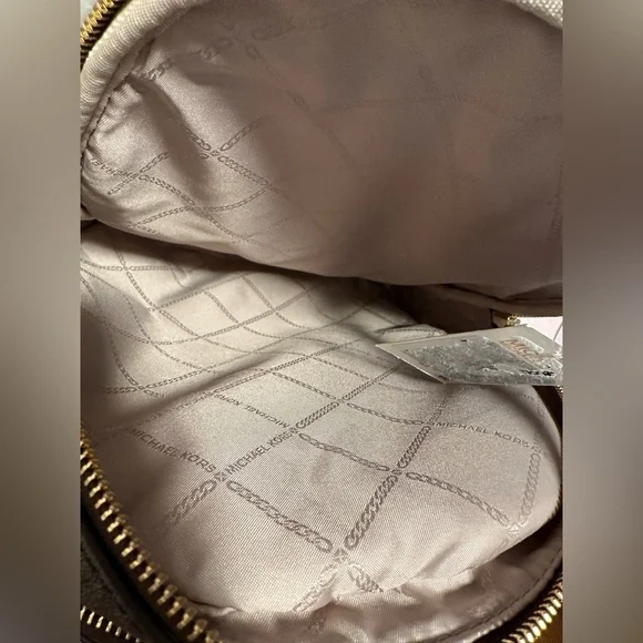 MICHAEL Michael Kors signature monogram backpack over your shoulder for luxe organization on the go.9-1/2"W x 12-1/2"H x 5"D (width is measured across bottom of the handbag)14-1/2" to 17-1/2"L adjustable backpack strapsZip-around closureGold-tone exterior hardware & 2 front zip compartments1 interior zip pocket & 5 slip pocketsMK signature coated twill faux leather; lining: polyesterImported