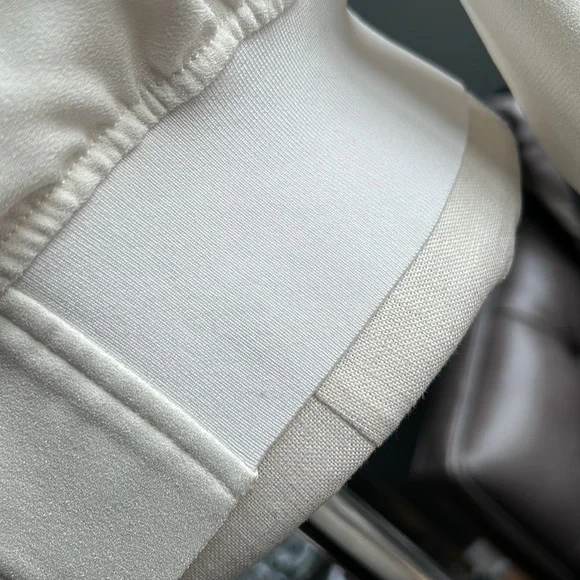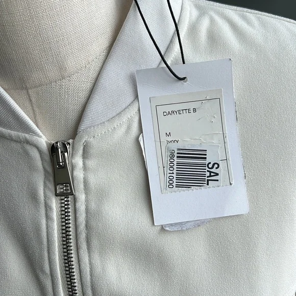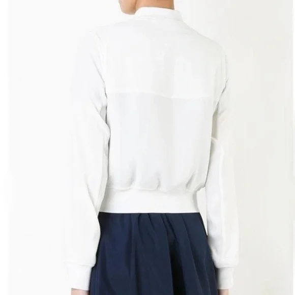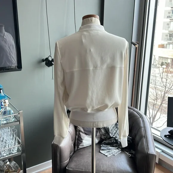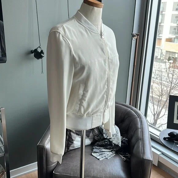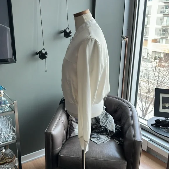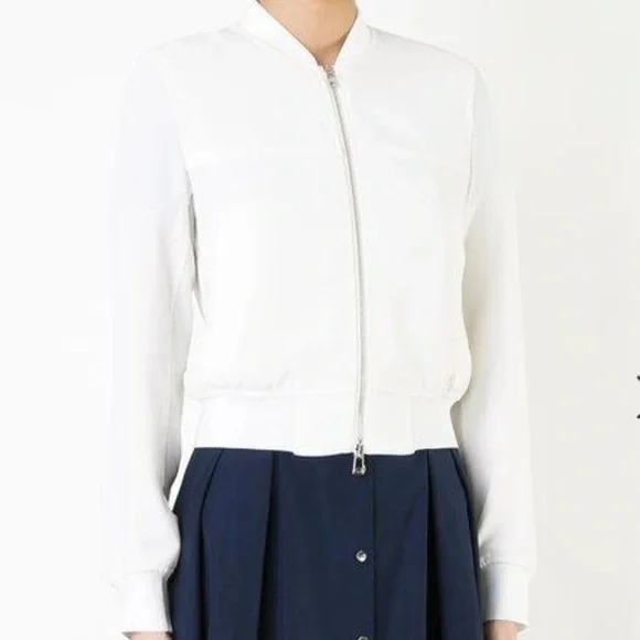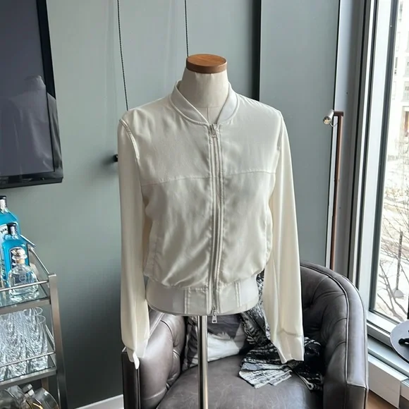 A Theory bomber jacket in a cropped profile. Tonal ribbing cinches the edges, and 2 pockets border the two-way zip placket. Long sleeves. Partial lining. Fabric: Crepe. Shell: 79% triacetate/21% polyester. Lining: 100% rayon. Wash cold or dry clean. Imported, China.Minor spot near waistband as photoed.
