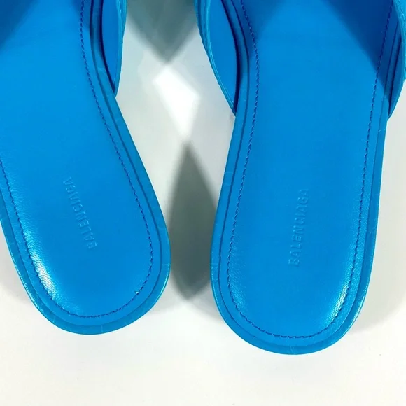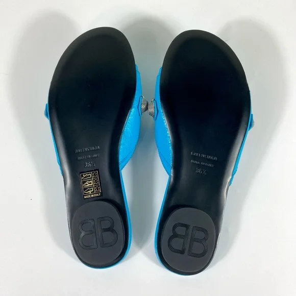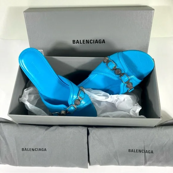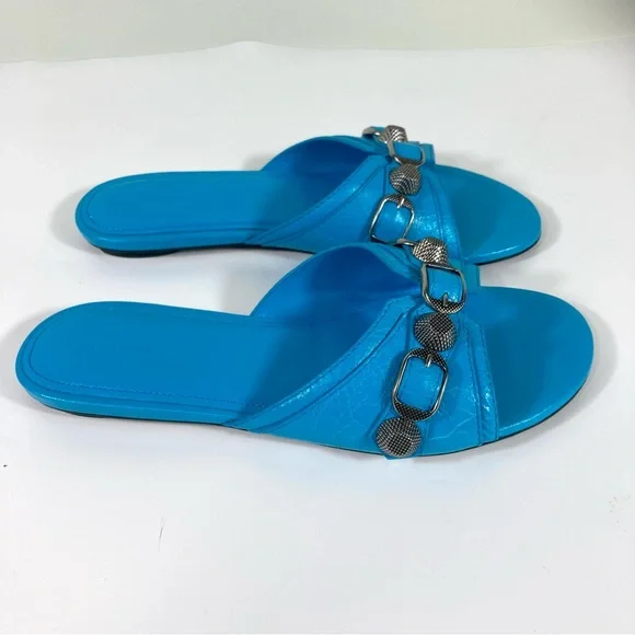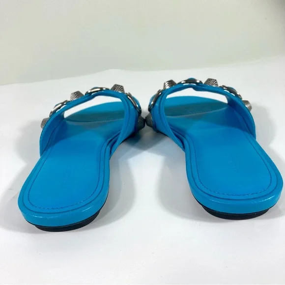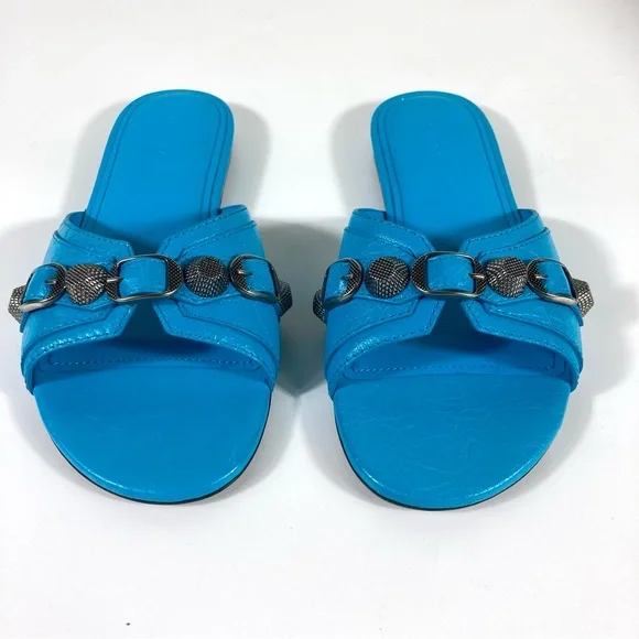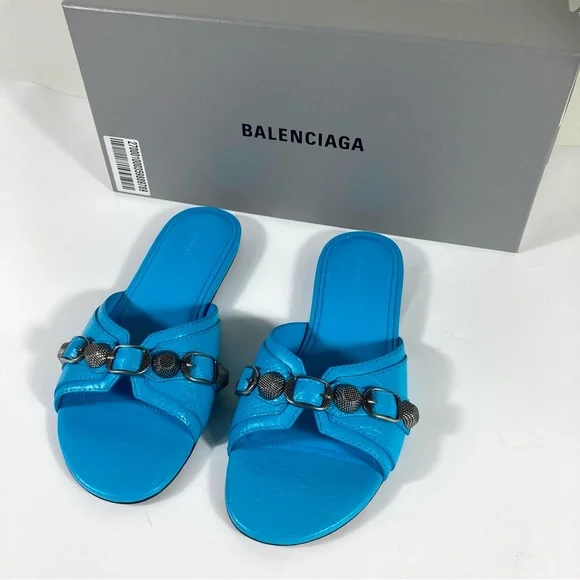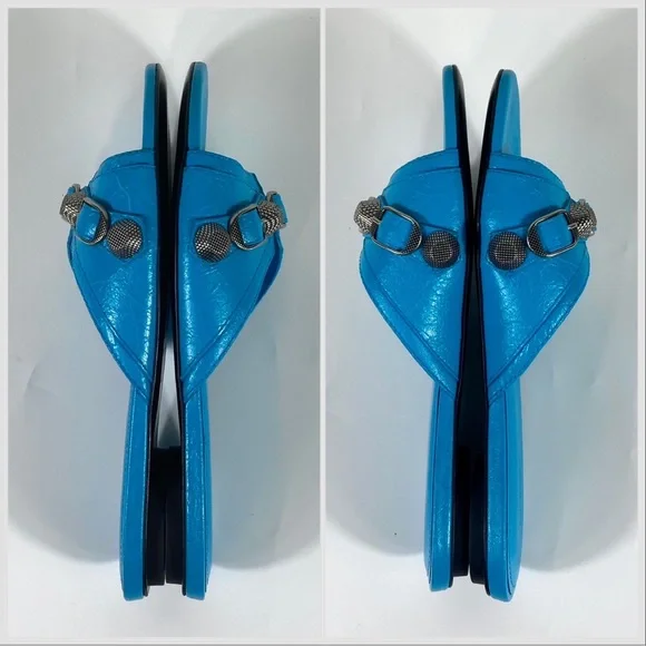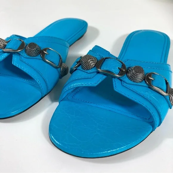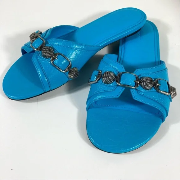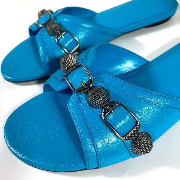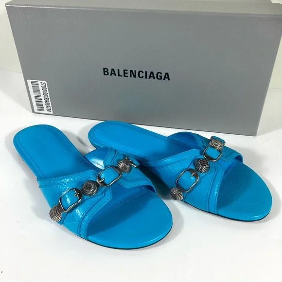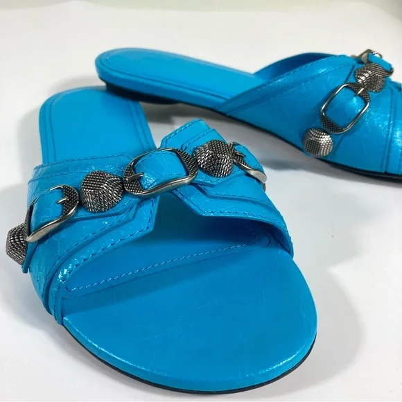 Crafted from cyan-hued calf leather, these Balenciaga Cagole sandals take inspiration from the popular bag that shares the same name. Features such as the flat-top studs and decorative buckles are signature elements of the style, adding a rebellious edge to the slip-on pair.NEW with box and dust bags!Retail: $750- Authentic- Color: Cyan / Aged Nikel - Size: 6.5US / 36.5EU- Adjustable straps with buckle closure- Contoured footbed- Sole: Calf Leather 100%- Lining: Calf Leather 100%- Outer: Calf Leather 100%- Made in Italy- Product ID: 694342WAD4E