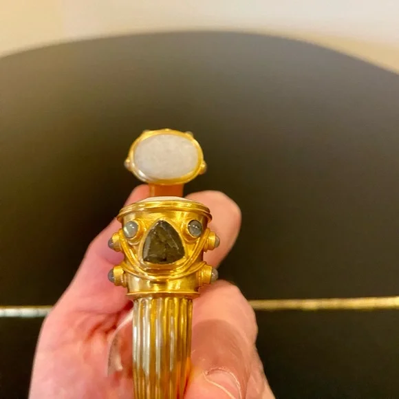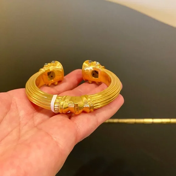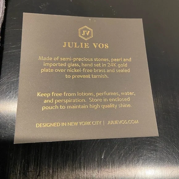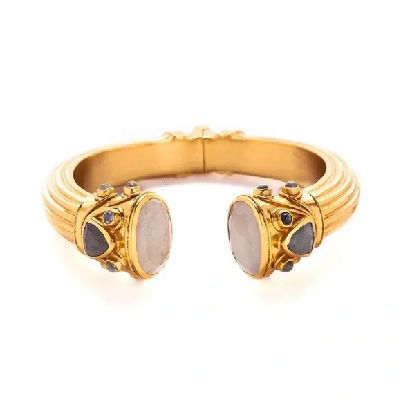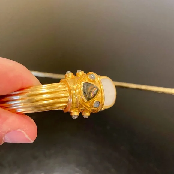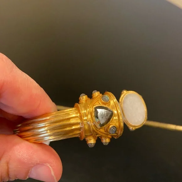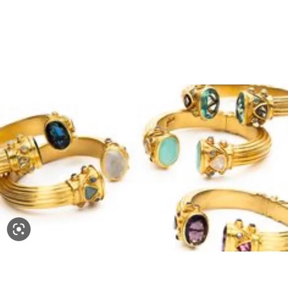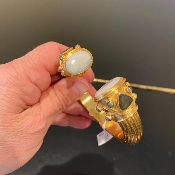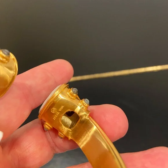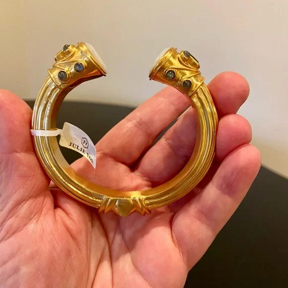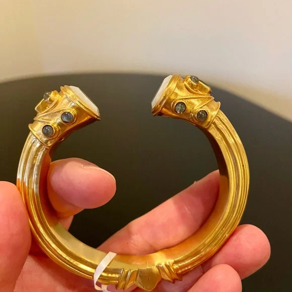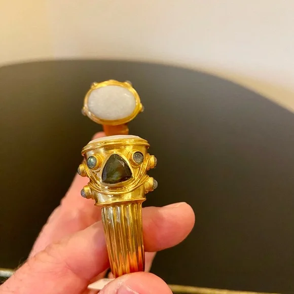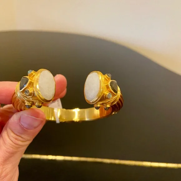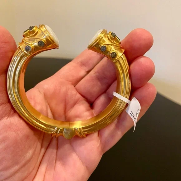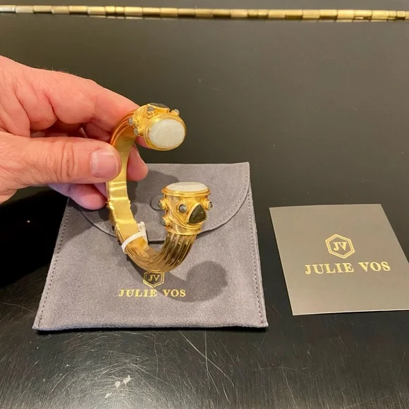 Authentic Luxury Julie Vos Mother of Pearl Byzantine Cuff/bracelet-beautiful,bold mother of pearl gemstone end-caps accented w/faceted labradorite trillion gemstones & smaller round labradorite gemstones-mother of pearl & labradorite have powerful physical & spiritual properties-ribbed cuff detail-hinged for comfort-diff angles catch different highlights & hues of gemstones-JV hallmark & JULIE VOS embossed on inside-Hand set in 24k gold plate over nickel-free brass & sealed to prevent tarnish-inside bracelet between 2.25”-2.5”,widest part it’s about 1”,mother of pearl end caps about .75”-SOLD OUT,JV doesn’t make labradorite pieces any more,makes this piece unique & rare,have not seen this anywhere-JV pieces designed & HANDCRAFTED to standards of fine jewelry,each piece is unique & each gemstone is unique w/own characteristics,ribbed detail not all exactly same all over because hand made,shown in pics,one of labradorite trillions wasn’t cut same as other trillion on one side,I see this in JV pieces because stones hand cut & try to point out,in pic,how made, each piece, stone, metal work, plating is unique,detail in metal hand done,any surface scratches,difference in plating,metal work because hand done,any difference in stones like slightly different cut, slight inclusion…are natural characteristics of stones-stock pics include other cuffs, I’m only selling this ONE Julie Vos mother of pearl cuff-orig pouch & product info/care instructions included-gift w/purchase