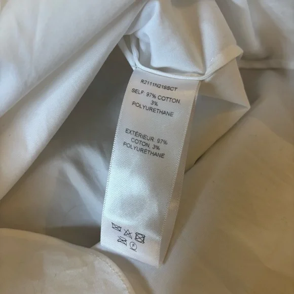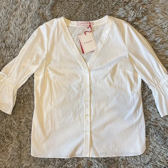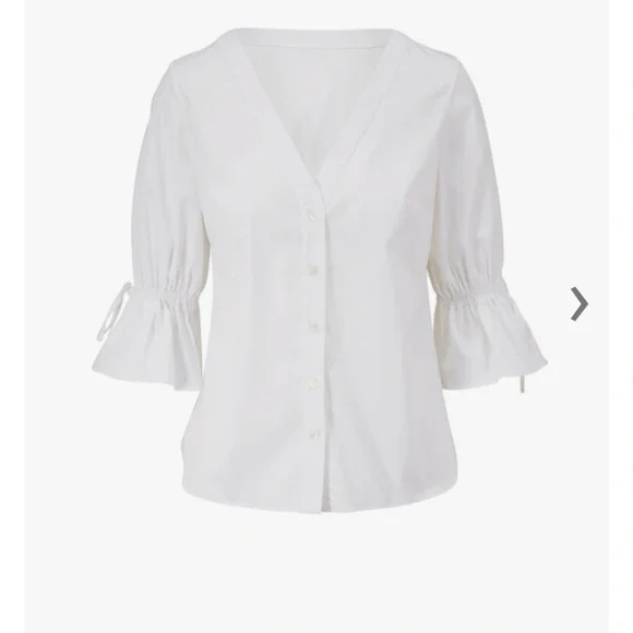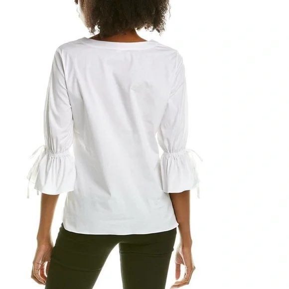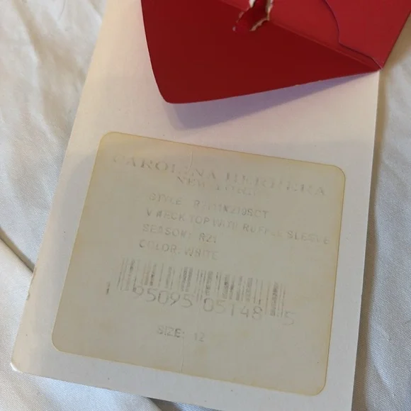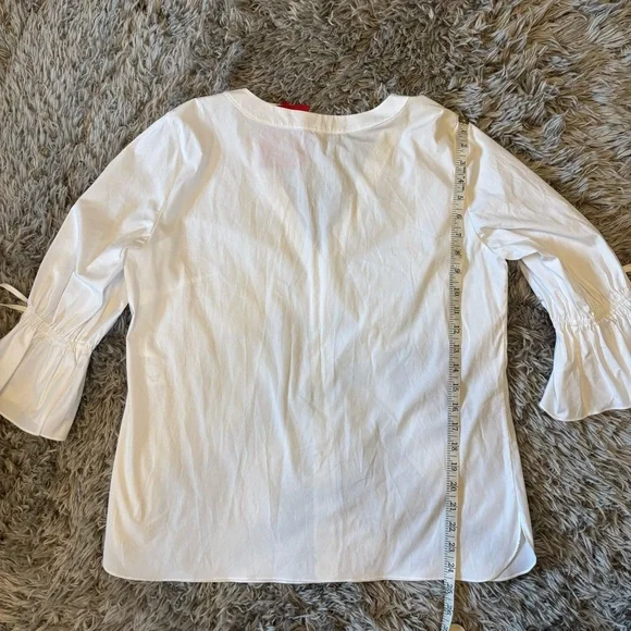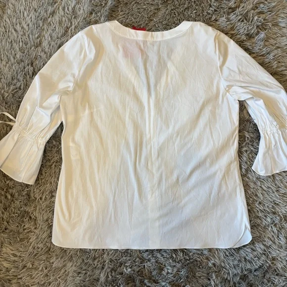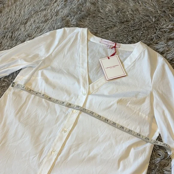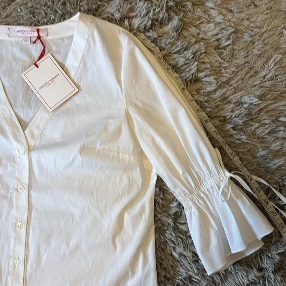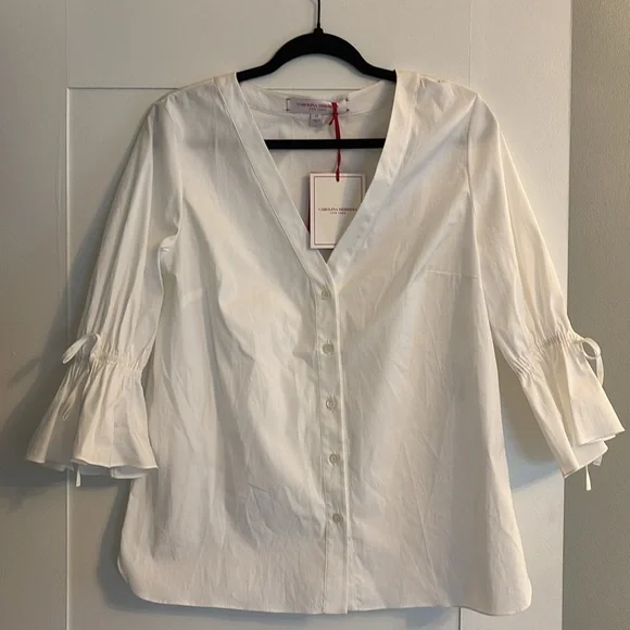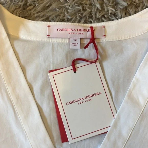 NWT new with tags. Red tag includes an extra buttonCarolina Herrera V-Neck Top with ruffle sleeve. I believe the style number is R2T11K219SCTV-necklineFront button placketSelf-tie ruffle cuffsRound, vented hemWhite. Size 12. 97% cotton, 3% polyurethaneDry cleanMade in ItalySmoke free home but not pet free