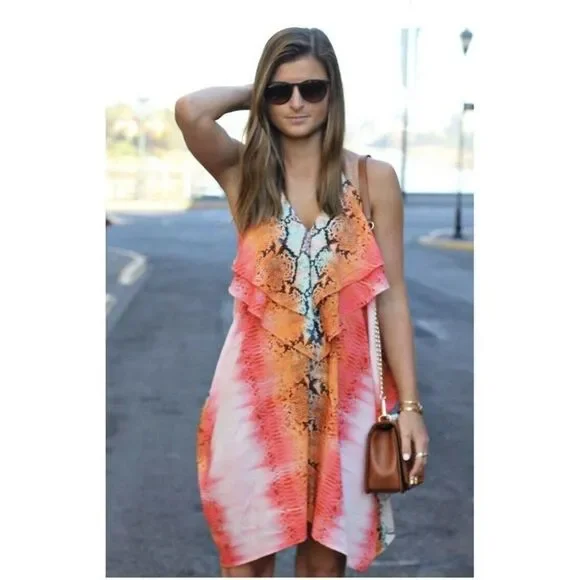 NWT LOVERS + FRIENDS APHRODITE DRESSSIZE MEDIUMAZTEC PYTHONAn airy Lovers + Friends dress with layered ruffles along the V neckline. Delicate straps meet at the draped racer-back overlay. Slim ties knot at the back keyhole.Lined.Fabric: Crepe. 57% viscose/43% rayon.Dry clean.ImportedAPPROXIMATE MEASUREMENTS:BUST: 19.5” acrossLENGTH: 34” front / 43” backItem may have line going through label to prevent return to retail store