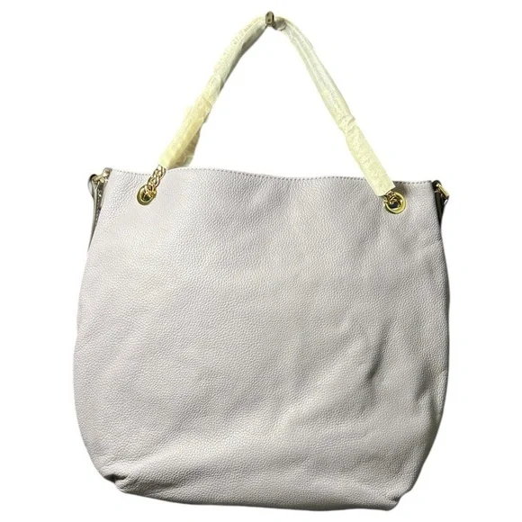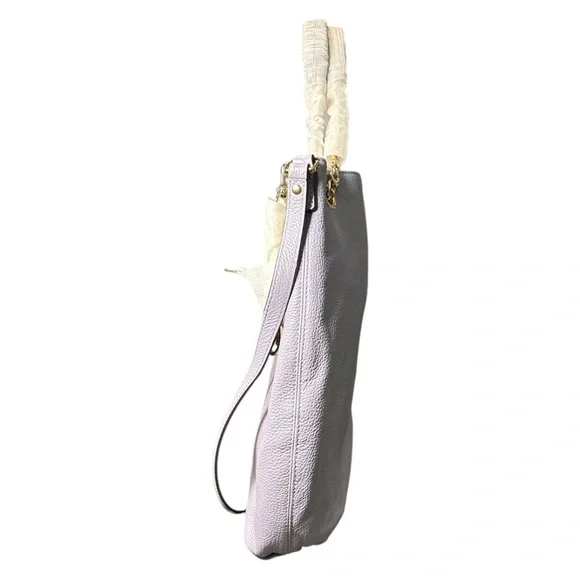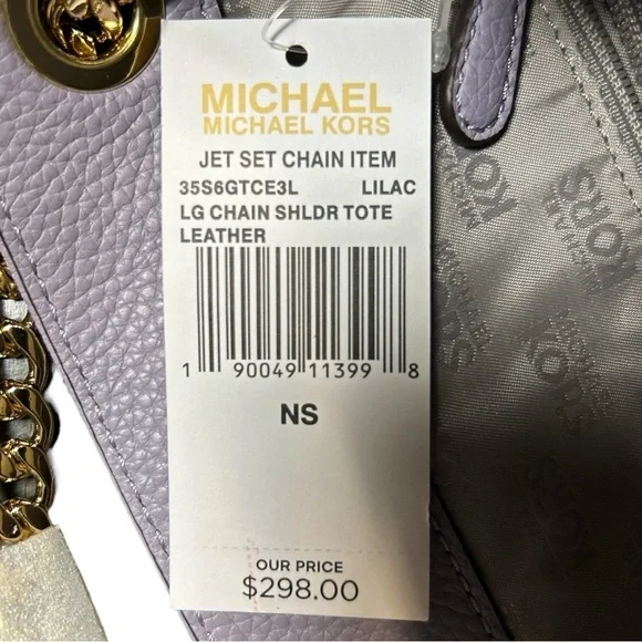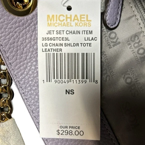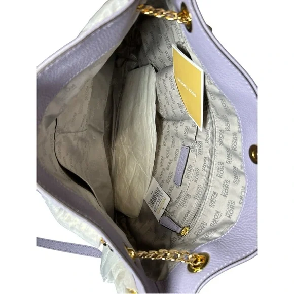 Bag is NWT with foam wrap on handles and charm. First picture best represents the lilac color. The other photos' color does not show well.Elevate your style with this gorgeous Michael Kors Jet Set shoulder bag. The lilac exterior color paired with gold hardware gives it a chic and elegant look that is perfect for any occasion. This large purse bag has a rectangular shape with double handles and an adjustable chain strap that can be worn over the shoulder.The bag features a magnetic closure, pebbled finish, and solid pattern. It has inner pockets, a maintenance card, and a bag charm. The lining is made of jacquard and fabric, and the bag height is 14 inches. This designer bag is perfect for travel, weddings, parties, cocktails, casual outings, workwear, and business meetings.