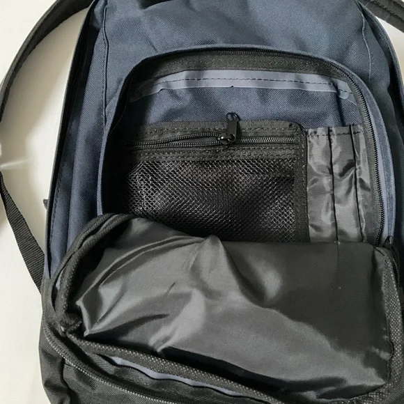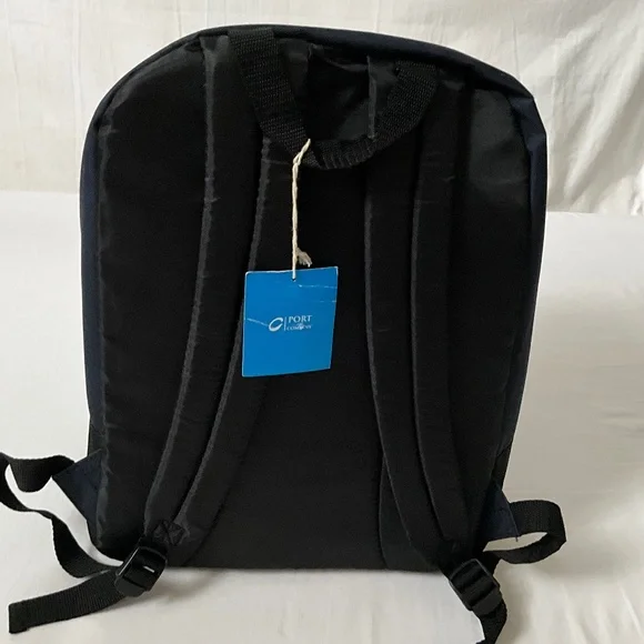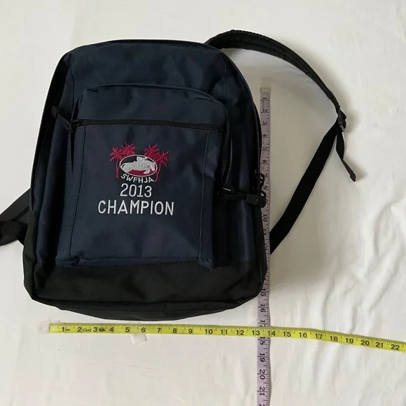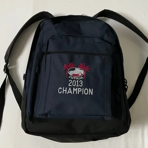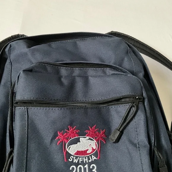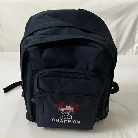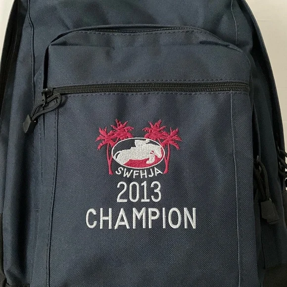 New with tag. Port & Company large, nylon canvas backpack in dark navy blue and black, with SFHJA (South Florida Hunter & Jumper Association) 2013 CHAMPION logo embroidered in crimson and white. Adjustable padded shoulder straps. Two full size interior compartments with dual zippers for opening/closing in either direction. Two zippered pouches on front. The larger one has dual zippers and a zippered mesh pocket inside. The smaller one (with logo) has single zipper. The backpack was never used, but ithas been moved about and boxed up over the years. No flaws found. May have light marks, dust or lint from handling. Measurements in photos. Cross listed under Kids due to relevancy.New to ? Create an account with referral CrickettsCache and receive a $10 credit towards your first purchase! Signing up is free!