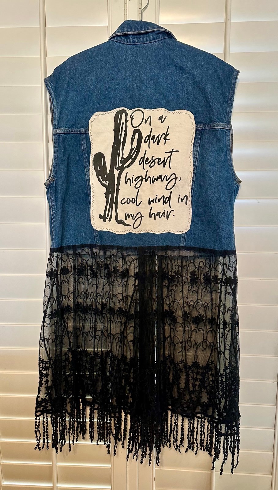 ON A DARK DESERT HIGHWAY EAGLES SONG upcycled jean vest lace tunic top XL