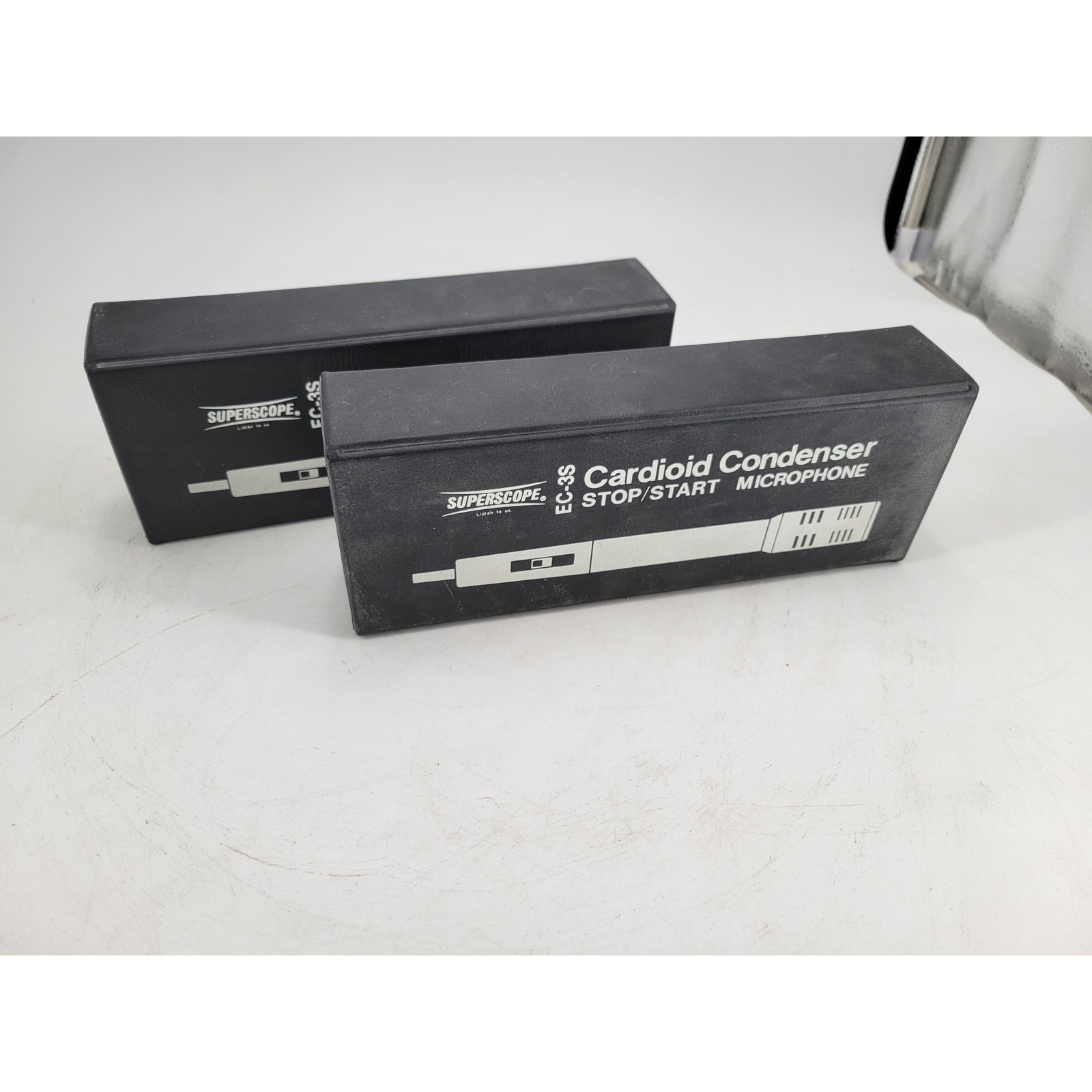 PAIR 70s vintage Superscope Cardioid Microphone Model EC-3S both with start-stop switch function for compatible recorders. One seems fine on our test VUs, the other works but seems weaker than the other. This may be due to battery corrosion on the terminals. You should consider these for display or rehabilitation.