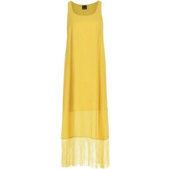 Pinko yellow maxi fringe sleeveless lining dress Made in ItalyUS size: 8In excellent Pre-owned condition. Gently used. Long, A line and sleeveless fabric flewy dress. Round neck with opening at the front andfringing at the hem. Lined. Both side and back long split, so special and sexy look. It is gorgeous dress, great for party, for vocation, for beach, for evening, for dinner etc., This garment is part of the "Dress to Impress" partywear capsule collection. Approx Measurements Laying Flat:Chest 35” Length: 53”Split to hem: 31”Weight: 10.6 OZ 100% polyester Hand wash with cold water Styled in Italy Made in ItalyPlease contact us with any questions prior to buying, check over all Measurements and Pictures. All items come from a smoke free and pet free home.