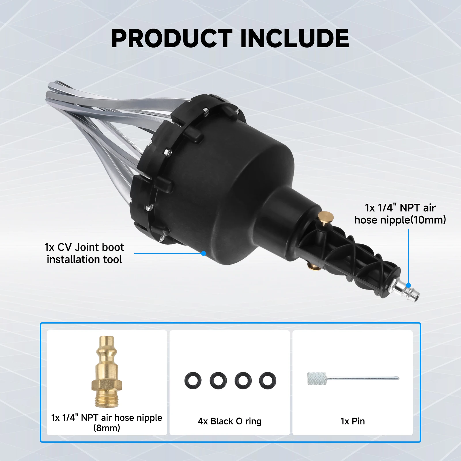 3.Pneumatic Operation: With a built-in pneumatic system,Lubricate the boot and place it on the expander fingers to activate the air to expand and place on the joint and release. This tool allows for quick and easy expansion of CV joint boots.
