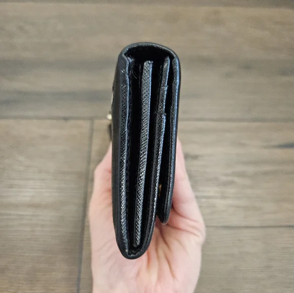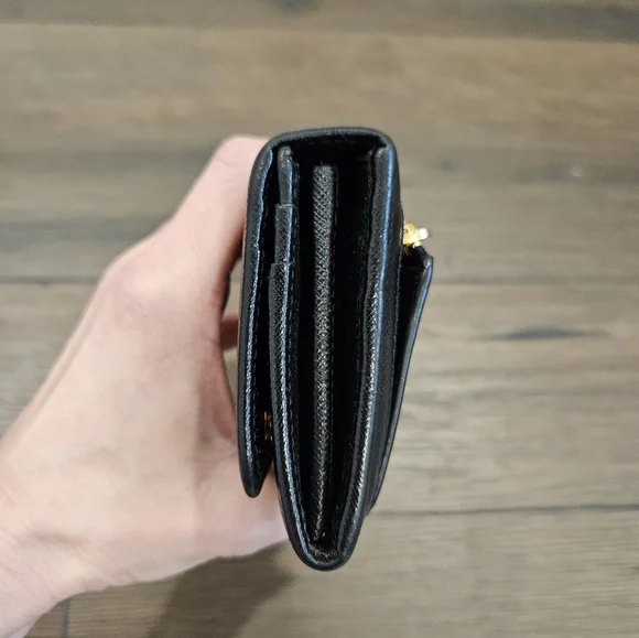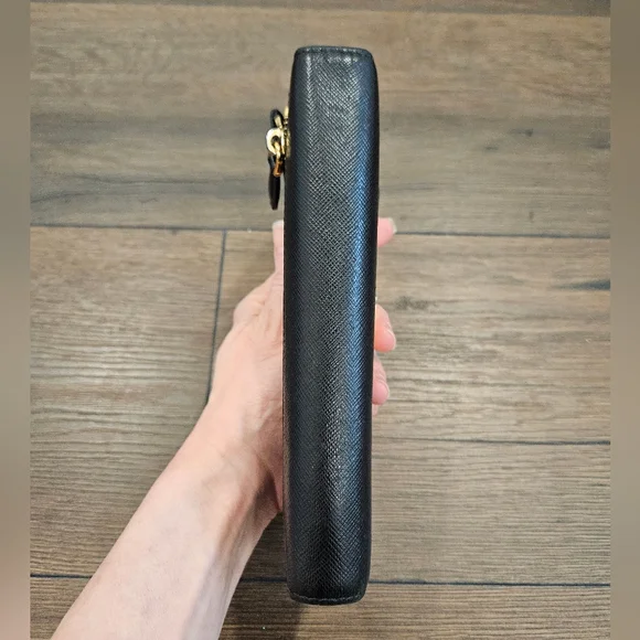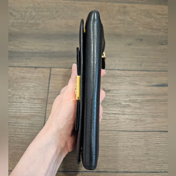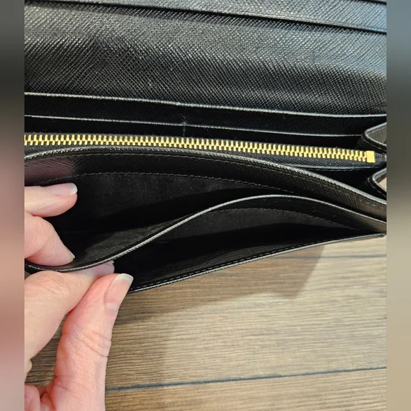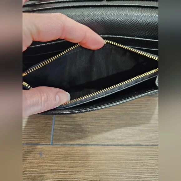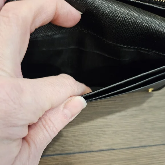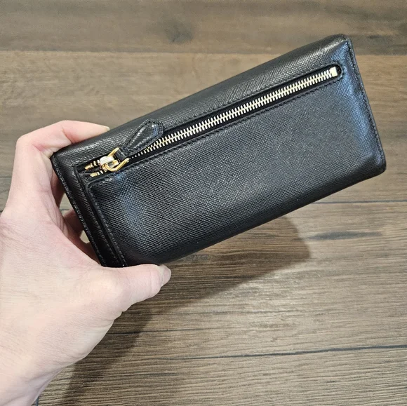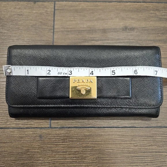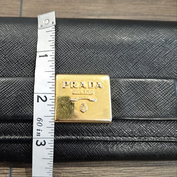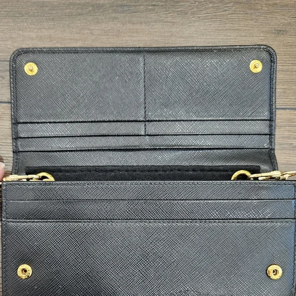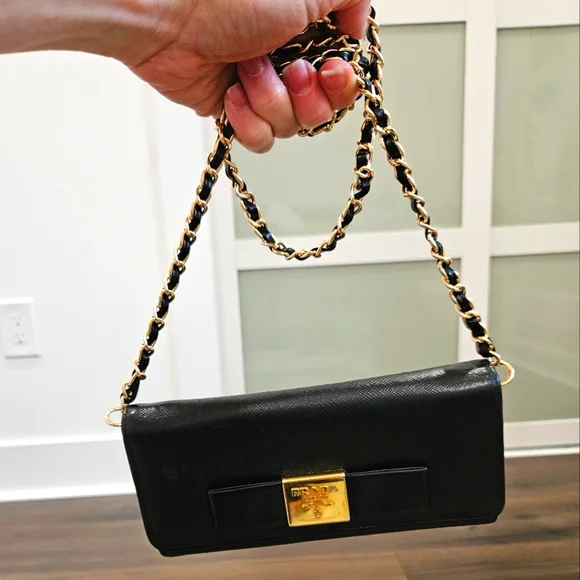 Elegant Prada black leather wallet on anything unbranded black+gold chain.She is preloved with minor showing of wear/rubs. Name plate is shiny with some mild rubbing/wear. Edges are smooth and beautiful! Inside is gorgeous and shows minimal wear/use. I'm including a crossbody kit that slides in the wallet and creates a crossbody purse without any damage or difficulty operating the wallet.Features multiple slots and excellent storage options!SHE IS A GORGEOUS PRADA! Comes with her card.Disclaimer: ◇Although I try my best to describe the condition of each item in pictures, please note that items MAY have unnoticeable flaws.◇The coloring of the product may not be portrayed exactly due to lighting◇All items are expected to show some signs of wear even if they are NWT◇Items may require cleaning per YOUR preference◇Please manage your expectations & review photos thoroughly. Ask questions on anything you need clarified as they are part of the description◇Items are sold "As-ls." No refunds, returns, or cancelations🚫 DO NOT BID & CANCEL 🚫Please bid responsibly🙏🏻✨️I keep all items for shipping in a smoke & pet FREE home. Items will arrive properly packaged for the protection of all purchasesBUNDLE TO SAVE! Thank u for shopping @ AmeliaDaxton✨️