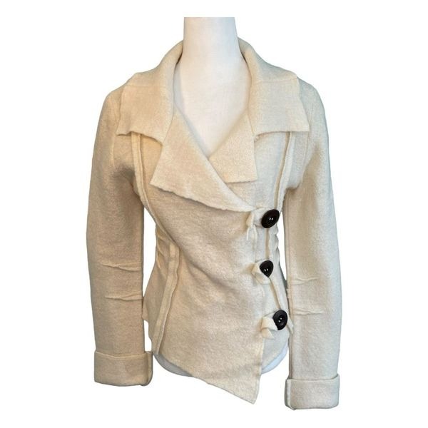 Purely Merino Australia Felt Wool Jacket in Ivory 100% Wool. It is a Full Button Front Blazer with a Three Button Closure, an Asymmetrical Front Hem and Reverse Seems through out. It has a great Bohemian feel and is the perfect lightweight between seasons coat.