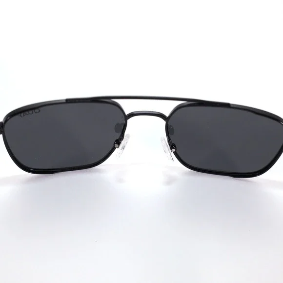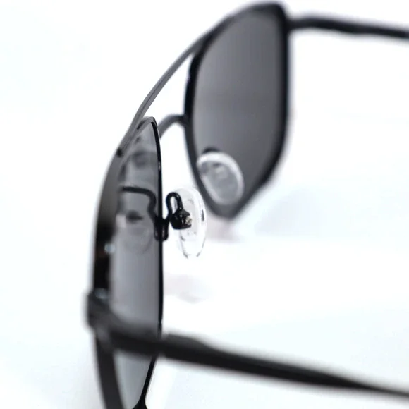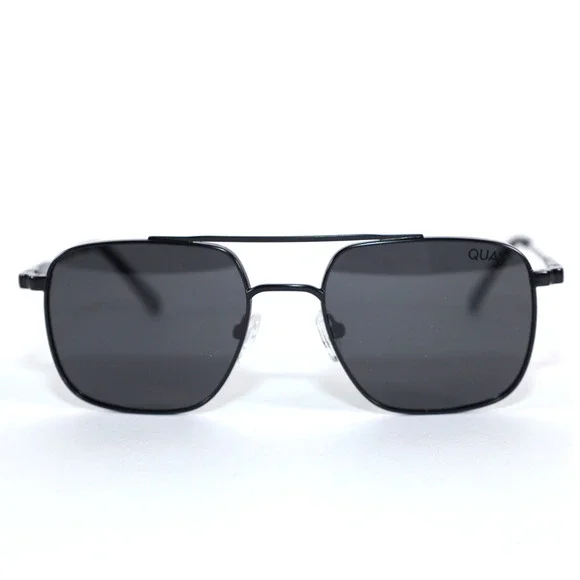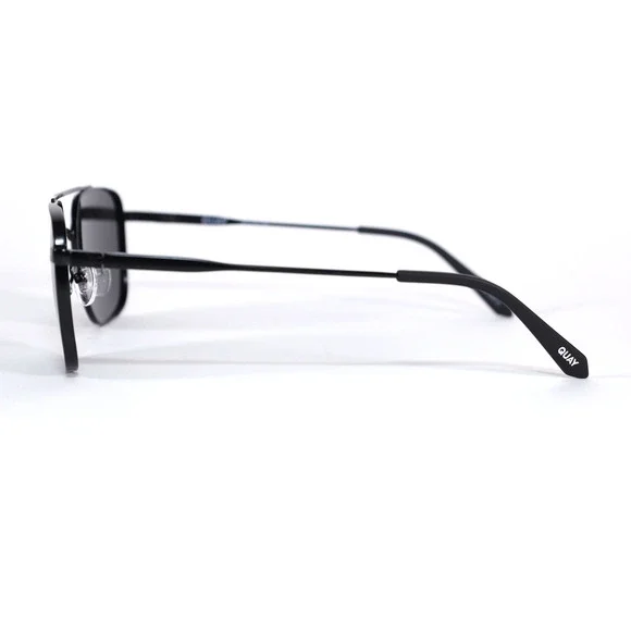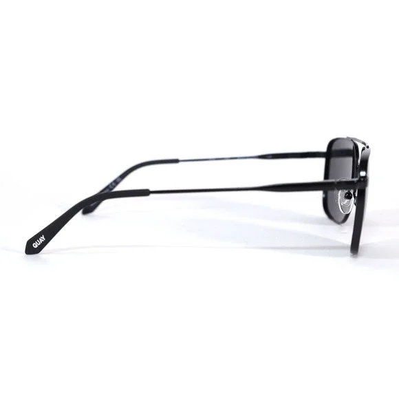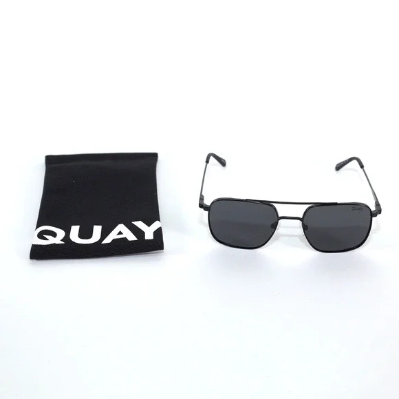 These BODYGUARD Aviator Sunglasses from Quay Australia are sophisticated and mysterious with Matte Black metal frames and dark polarized lenses.*Size:Lens width: 54mmBridge: 19mmTemple: 145mm*Frames: Square shaped, full frame, lightweight metal aviators in matte black*Lenses: Black polarized lenses*Standard metal arms with the Quay name/logo in silver at the temples*Adjustable nose pads*Includes a black canvas Quay sunglasses case and lens cloth*New With Tags