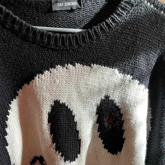 Worn once, like new sweater made from supple virgin wool. Apart from its distinctive high-cut crop at the waist, the silhouette has been built with a wide collar, dropped shoulders and broad cuffs. A large Smiley Intarsia motif is placed at the center of the sweater with a subtle tilt and has been shifted slightly to the left side of the body. Raf Simons’ cursive “R” logo sees a thin red embroidery, adding a nuanced accent to the black and white shades.