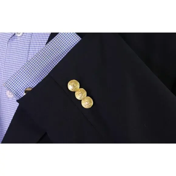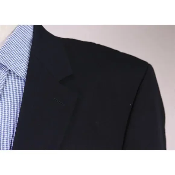 Brand: Ralph by Ralph Lauren * Size: 46R. Please follow my measurements * Measurements (Laying flat, Unstretched):Jacket:Underarm to Underarm on back: 24.5 inchesLength on back(from under the collar): 31.5 inchesWaist (at the middle/top button): 24 inchesShoulder to shoulder: 20.75 inchesSleeves from shoulder seam to end of cuff: 23.5 inchesExtra material to sleeves: 3 inches* Material: 100% Wool - Weight: Medium to Light Weight* Color: Navy Blue* Design: Solid* Jacket:Two Button Single BreastedNo VentThree Interior PocketsThree Exterior PocketsFour Faux Buttons on the cuffsFully LinedGold metal buttons* Condition: Gently Used. No stains or tears.* Inventory Code #B11626Powered by SixBit's eCommerce Solution