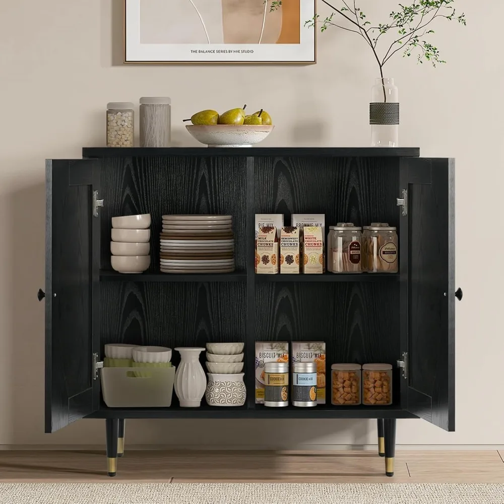 Rattan Buffet Cabinet with Storage, Black Sideboard Cabinet with Rattan Decor Doors, Buffet Table with Storage, Black Console T