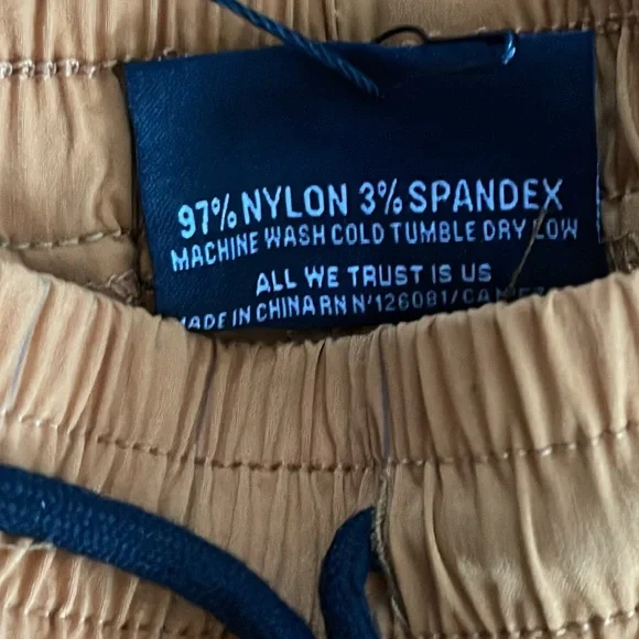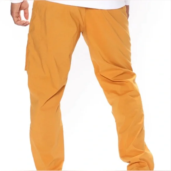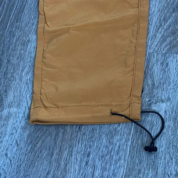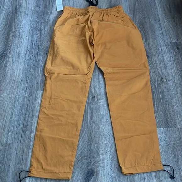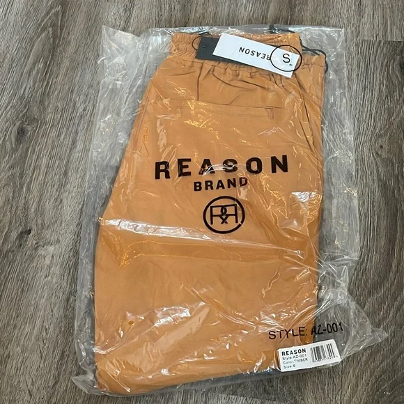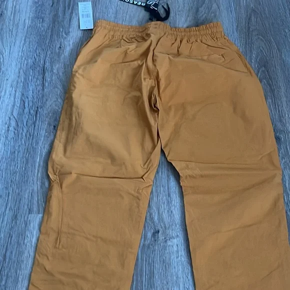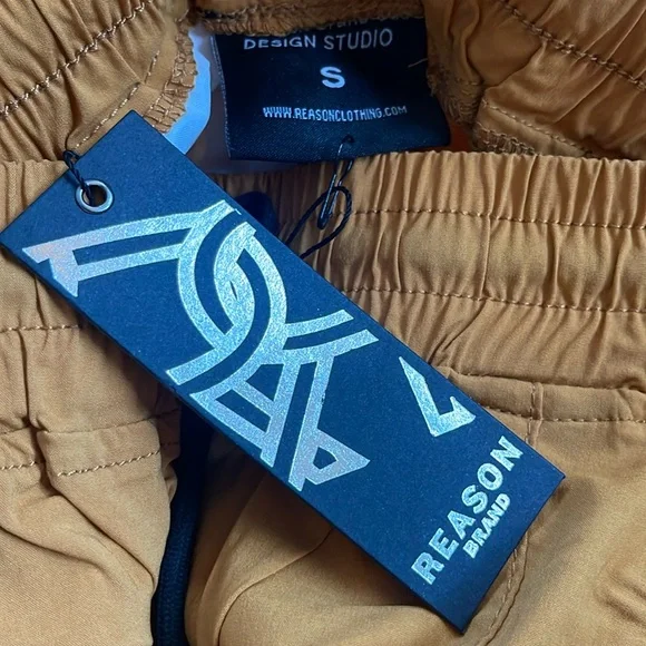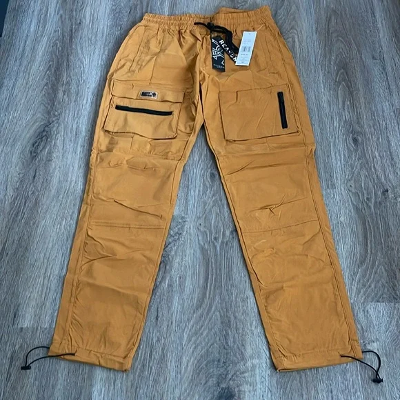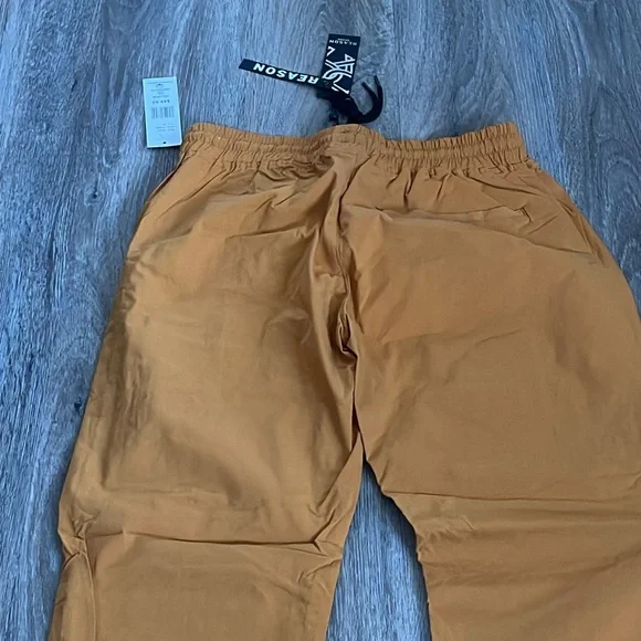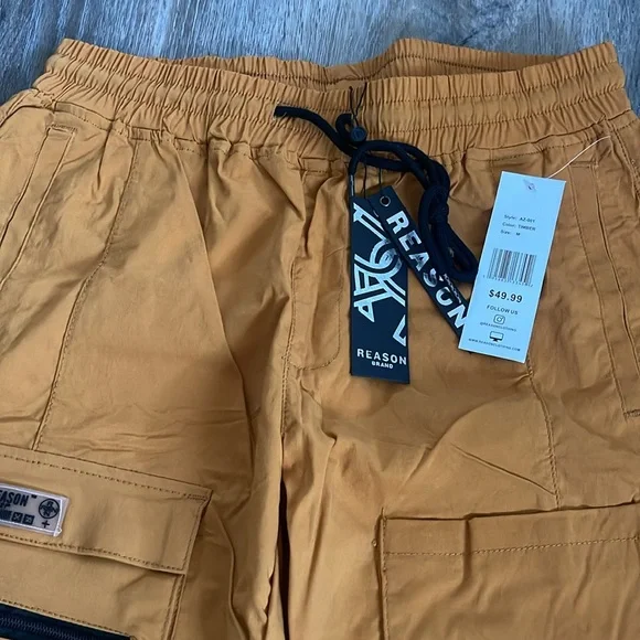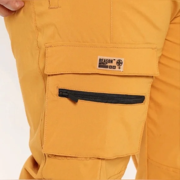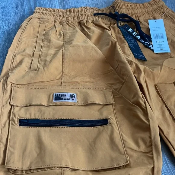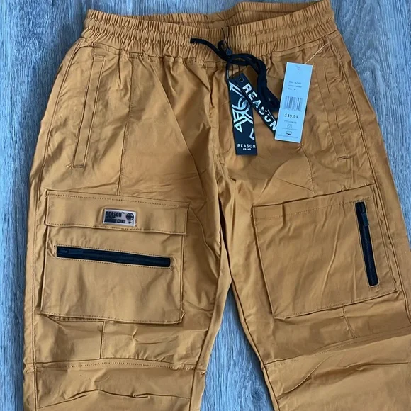 New with tags Reason Timber Cargo Pants -Fashionable and functional cargo pants -Elasticized waistband with drawstring -Two front side pockets are faux—all others are real -Zippered pockets throughout -Color: Burnt Orange/Brown with black accents (zippers ect)-97% Nylon, 3% Spandex Size Small fits 28-30” waist Waist flat lay 14”Total length 39.5”