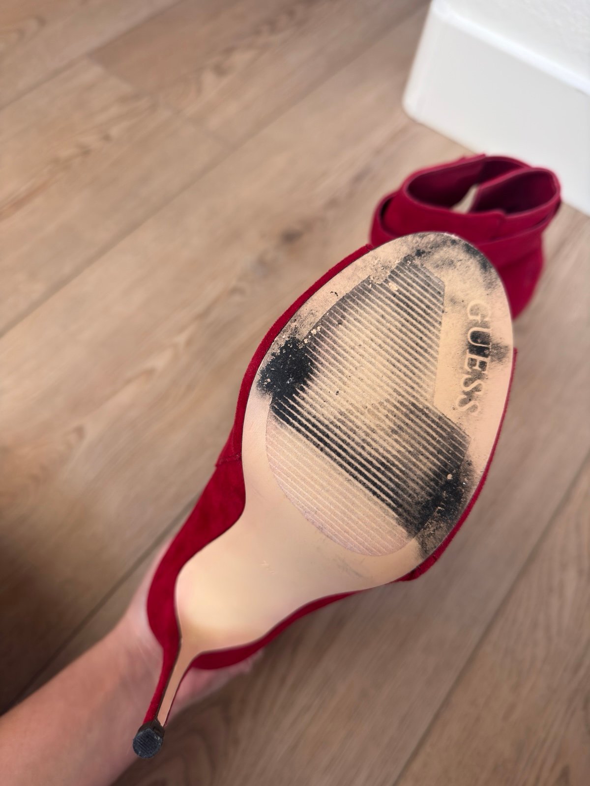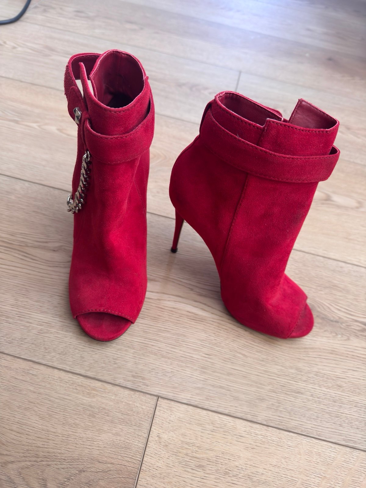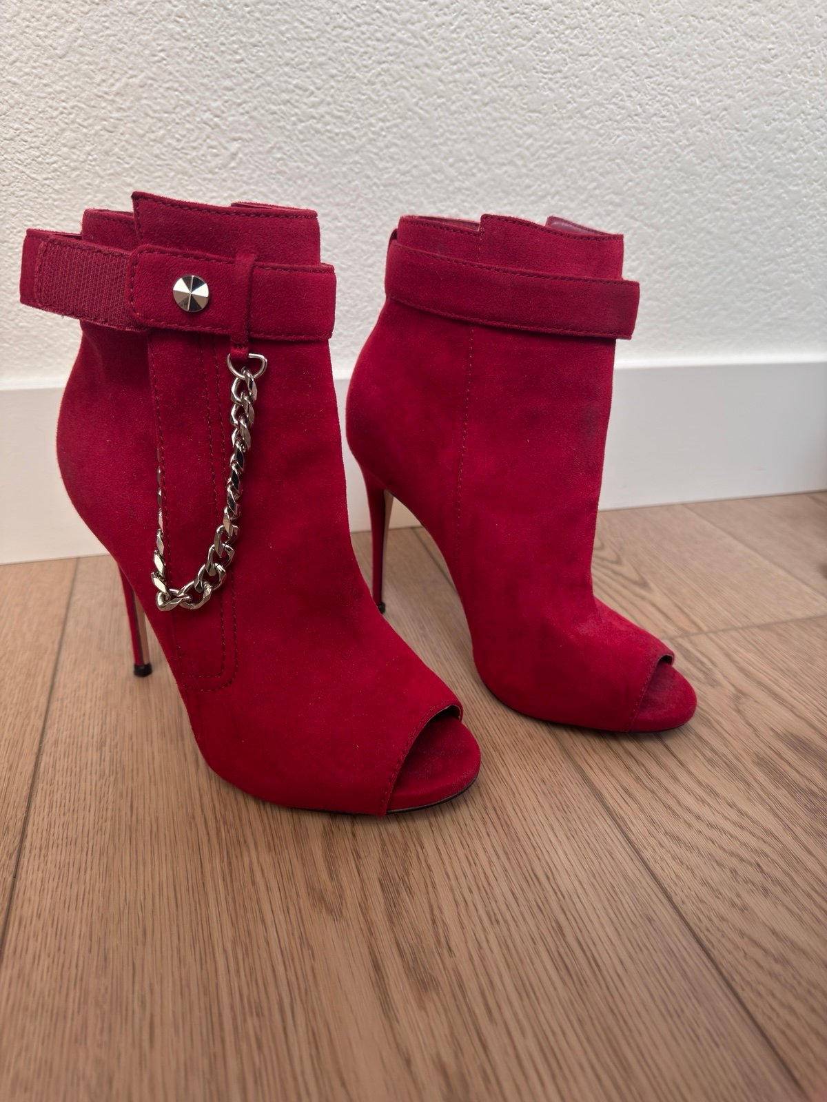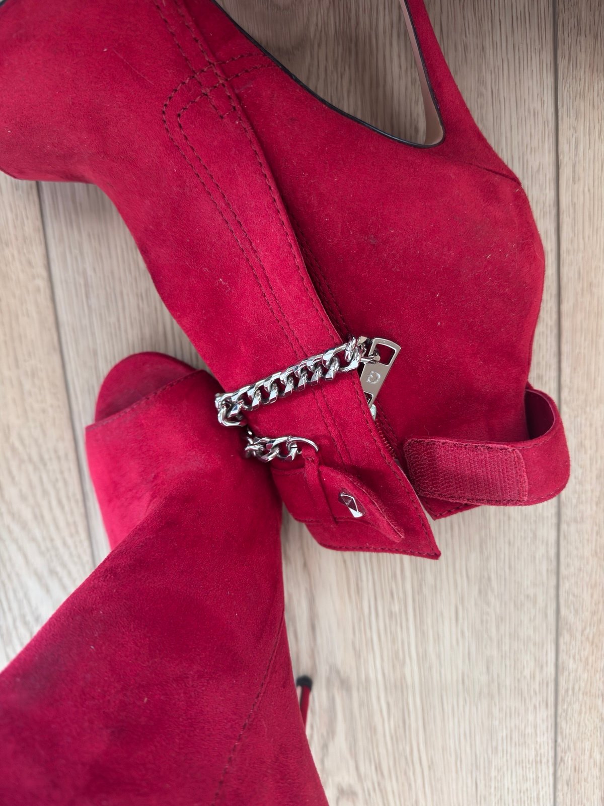 Statement red suede booties with stiletto heels and silver chain detail. The bold color and edgy design make them perfect for night outs, parties, or adding a pop of color to any outfit.