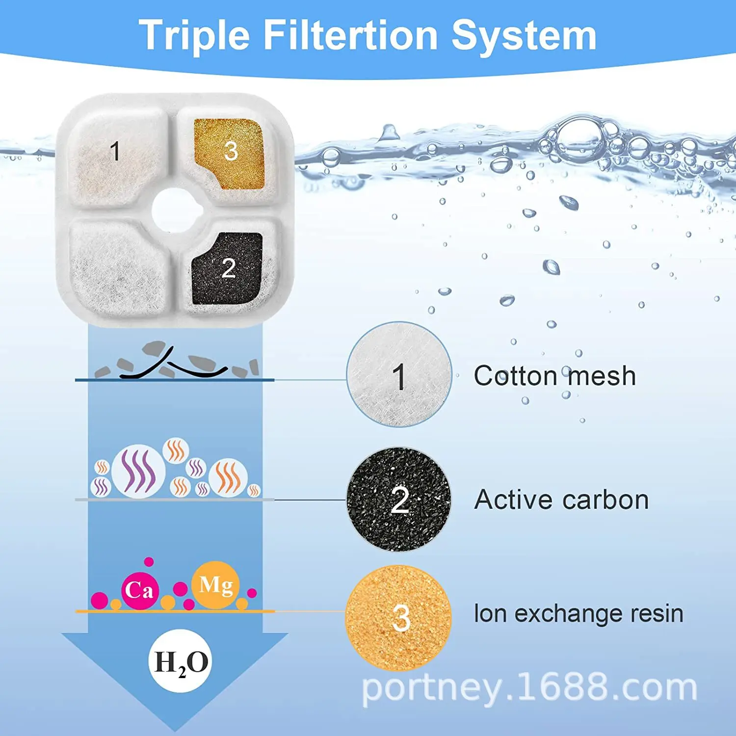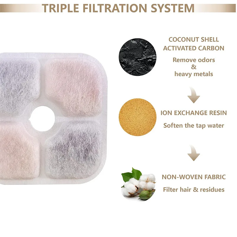 2. Multiple Filtration Layers: The high-density micro-porous filter cotton, activated charcoal, and ion exchange resin in this filter effectively remove hair, debris, odor, and heavy metal ions to provide your cat with clean and safe drinking water.