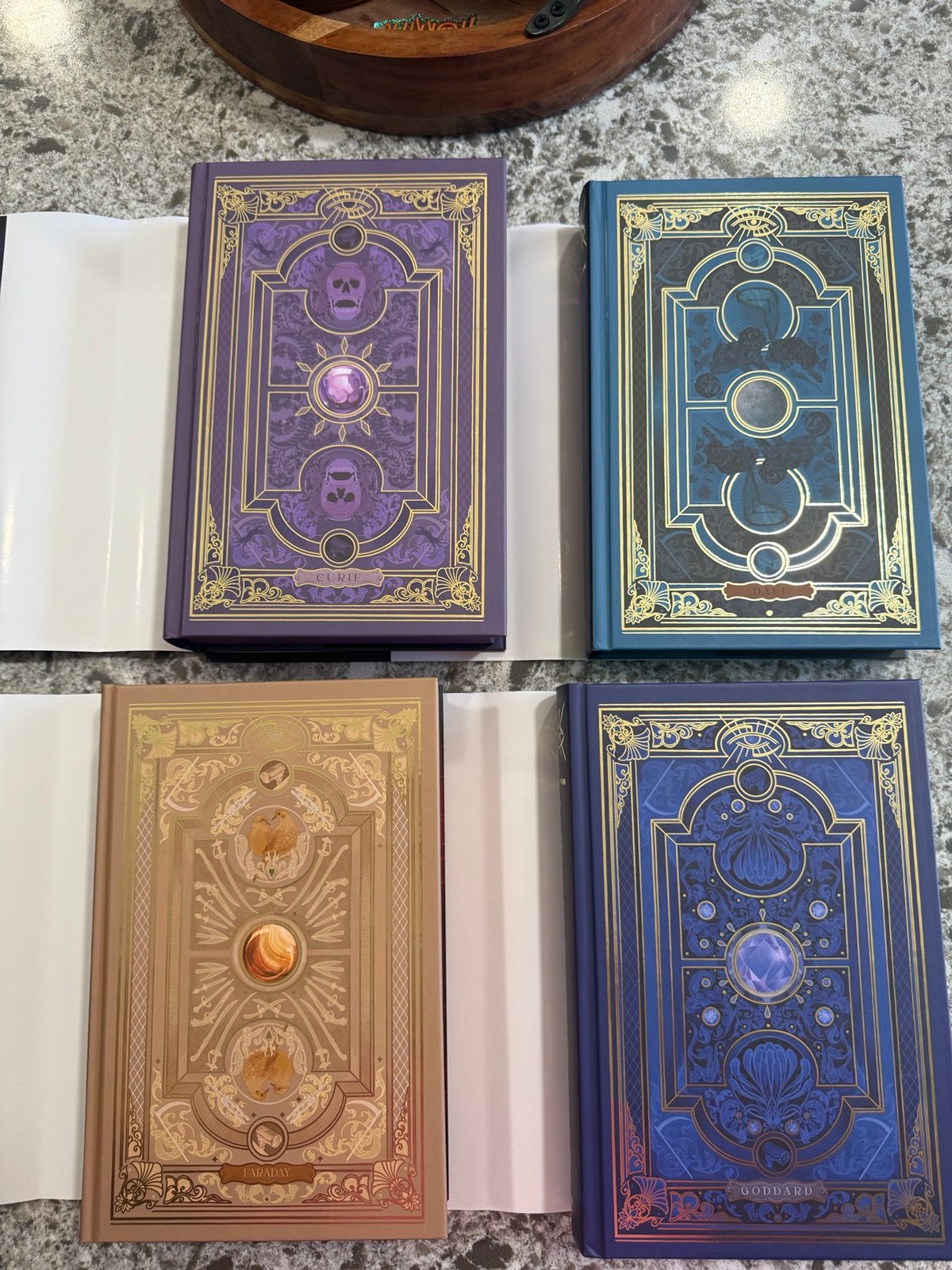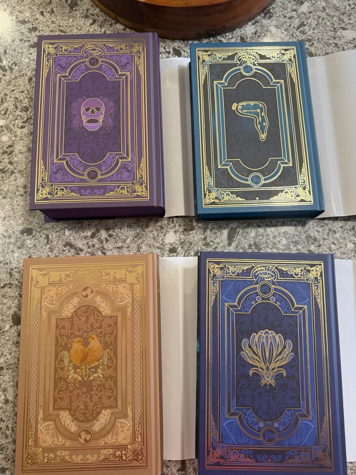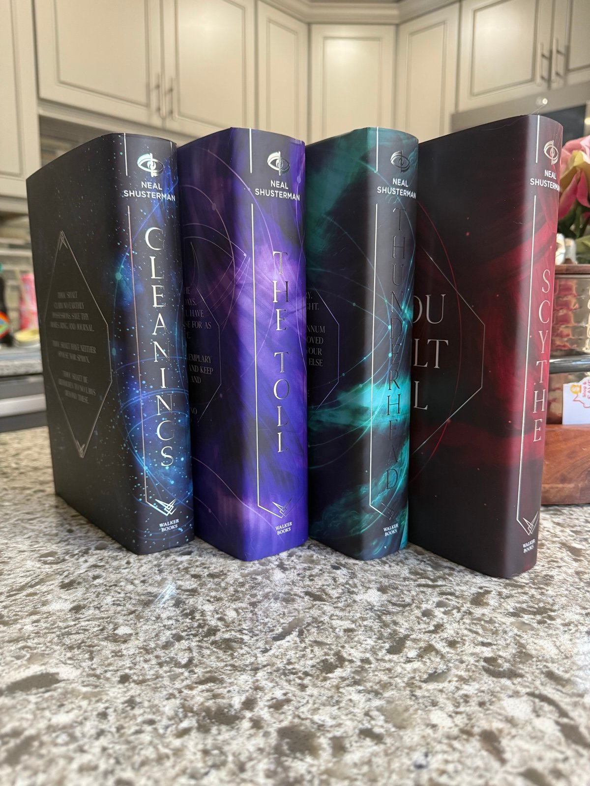 This is a listing for the signed Illumicrate Set of the Arc of the Scythe by Neal Shusterman. These books have been redesigned with beautiful artwork within the end pages as well as beautiful detailed sprayed edges. The hardcovers are stunning with artwork directly on them. These books are signed by the author and this listing will include: