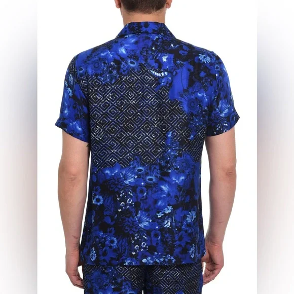 LIMITED EDITION BLUE UNIVERSE SHORT SLEEVE BUTTON DOWN SHIRTRobert Graham's Blue Universe shirt exudes bursts of midnight skies with dark nocturnal florals and contrast key prints. Crafted of silk, this collared style features short sleeves and a button-front closure. Camp collar Short sleeves Button-front closure 100% silk Dry clean Imported S