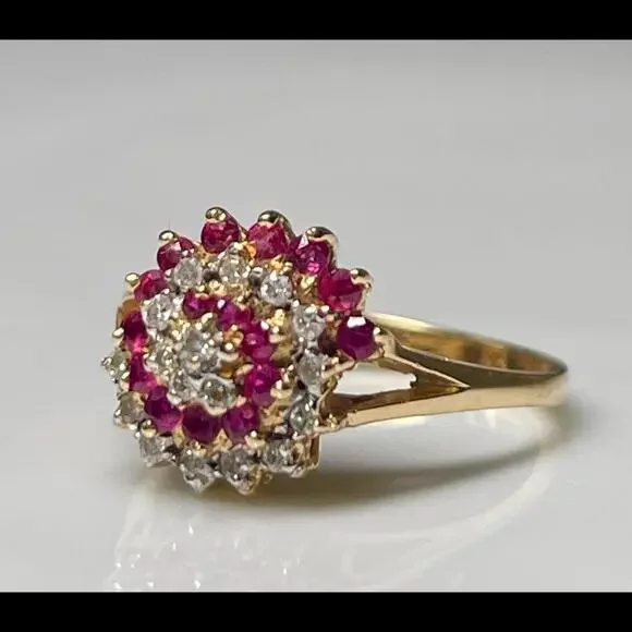 Genuine natural ruby and genuine diamond ring in 14K solid yellow gold with a wonderfully unique cosmic whirl galaxy celestial theme. Saturated round cut ruby stones are swirled with round brilliant cut diamonds of nice quality. There are 17 diamonds and 16 rubies. The ruby stones measures 2 mm each and taper down to 1.1 mm for a total ruby carat weight for the ring of about .45 carat. The 17 diamond stones measure 1.8 mm down to 1 mm for a total diamond carat weight for the ring of about .35 carat. They are very sparkly, eye clean, SI1 (only slight crystal inclusions visible under magnification) and in the mid near colorless range. The ring weighs a sturdy 3.3 grams.The top of the setting measures ~12 mm across. When worn, the top of the setting is elevated 4 mm from the finger. Total ring weight is 3.3 grams. Marked inside of band and tested for 14K (solid) gold. Ring is in great condition.Currently a size 6.5 and could be sized by my jeweler for an additional minimal fee if you like by adding the custom sizing option at checkout.#cosmic #galaxy #space #celestial