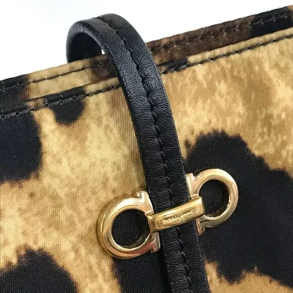 NAME:Salvatore Ferragamo Gancini Leopard leopard pattern Tote BagSHAPE:Tote BagCOLOR:Brown x BlackMATERIAL:Nylon / LeatherAPPROX SIZE:W12.6×H9.8×D5.9inch / W32cm×H25cm×D15cmHandle: 16.5inch / 42cmThe base is used to measure the width.Listed hand measurements may have a 1-2cm difference.Gender:Women'sSpec:[Open type]fastener[Inside] Open pocket x 2,Zipper pocket x 1ADDITIONAL ITEMS:NoneITEM RANK:Used SA RankCONDITION DETAILS:Handle - Strap:Cracking on the edgesCorners and edges:scrapes,FluffingMetal fittings part:Minor scratches