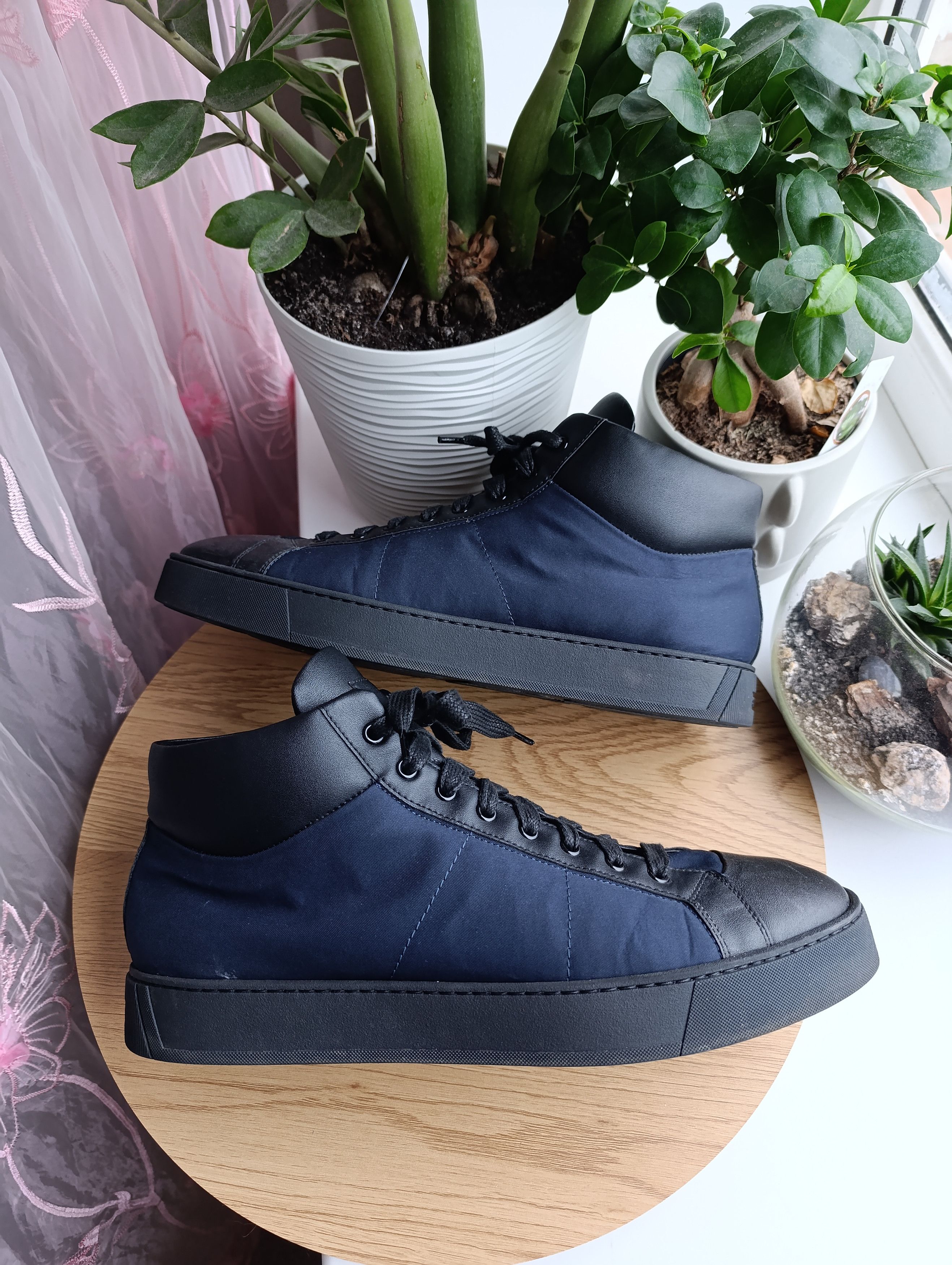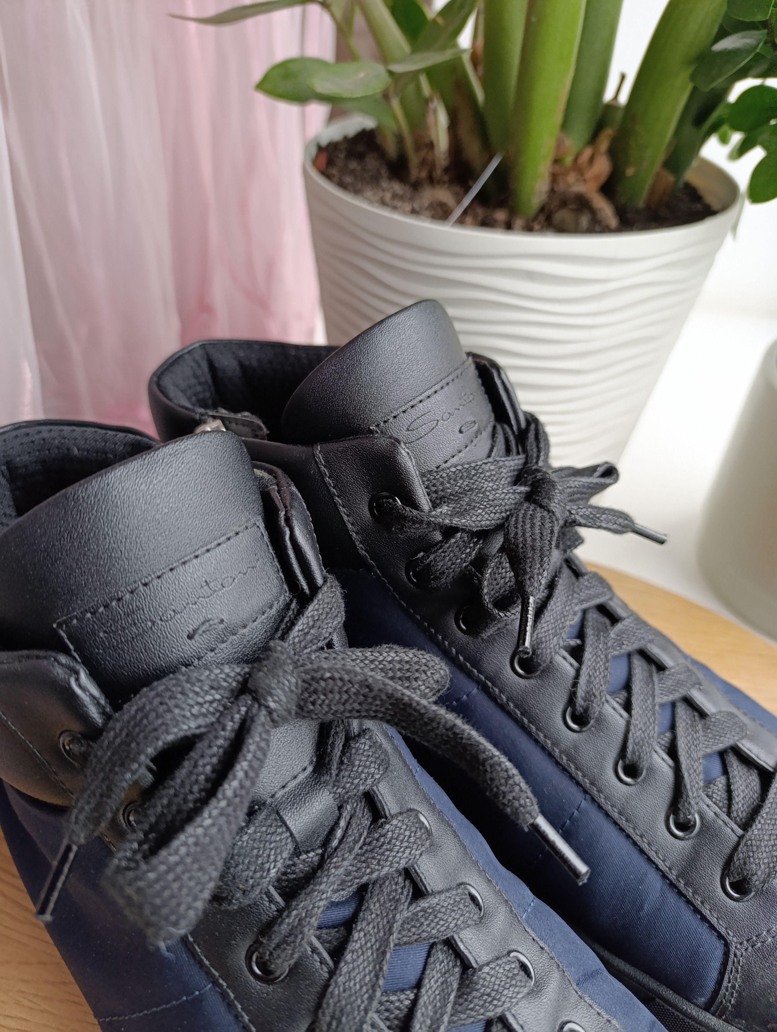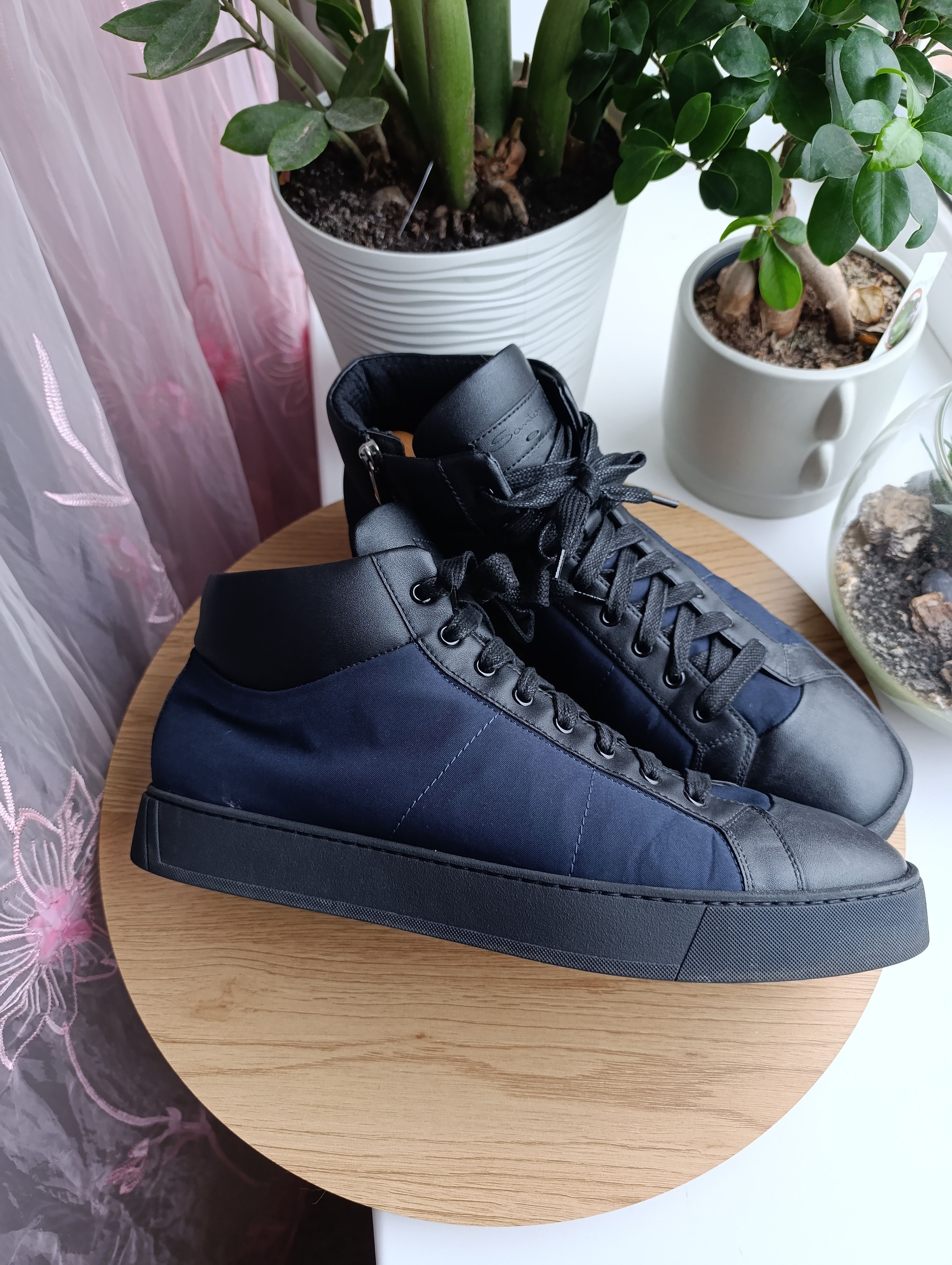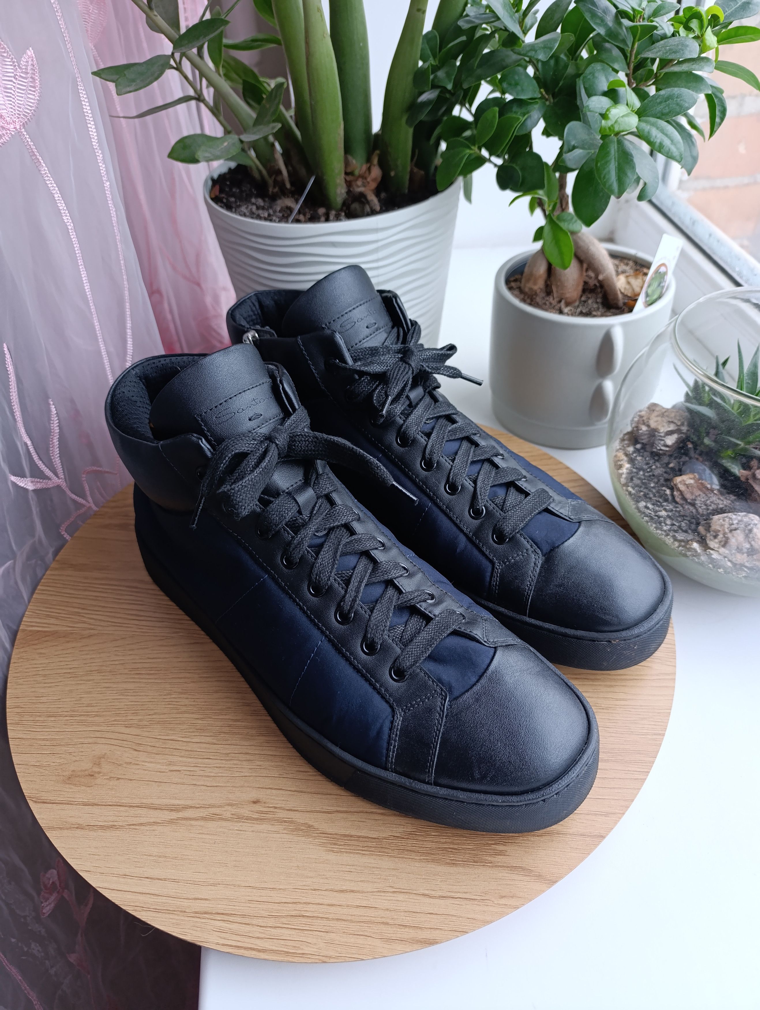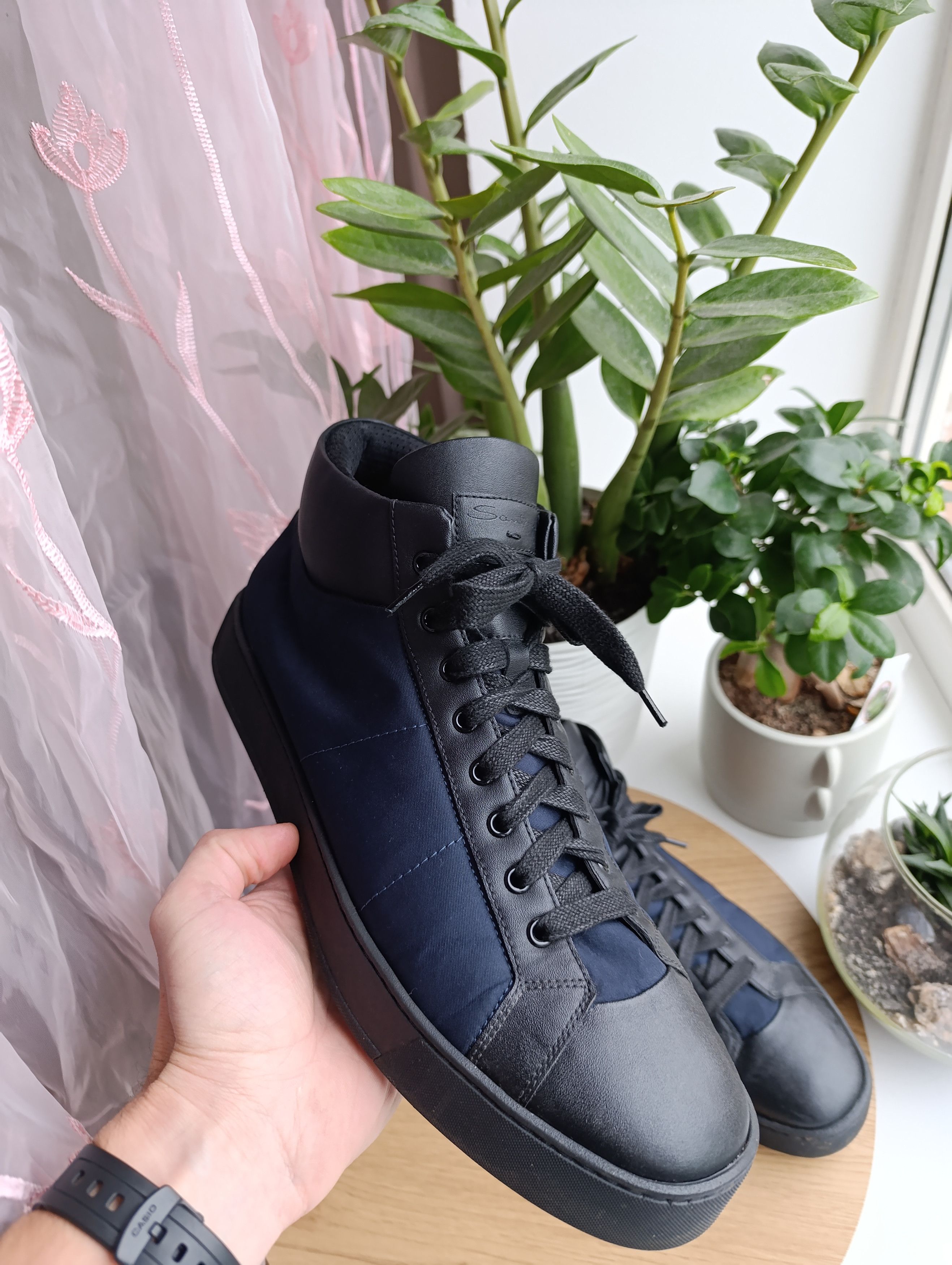 Men's high-top sneakers made of genuine soft leather and textiles from Santoni. High premium quality, side zipper for convenience. Size is UK12 US13. Excellent condition, but no insoles.
