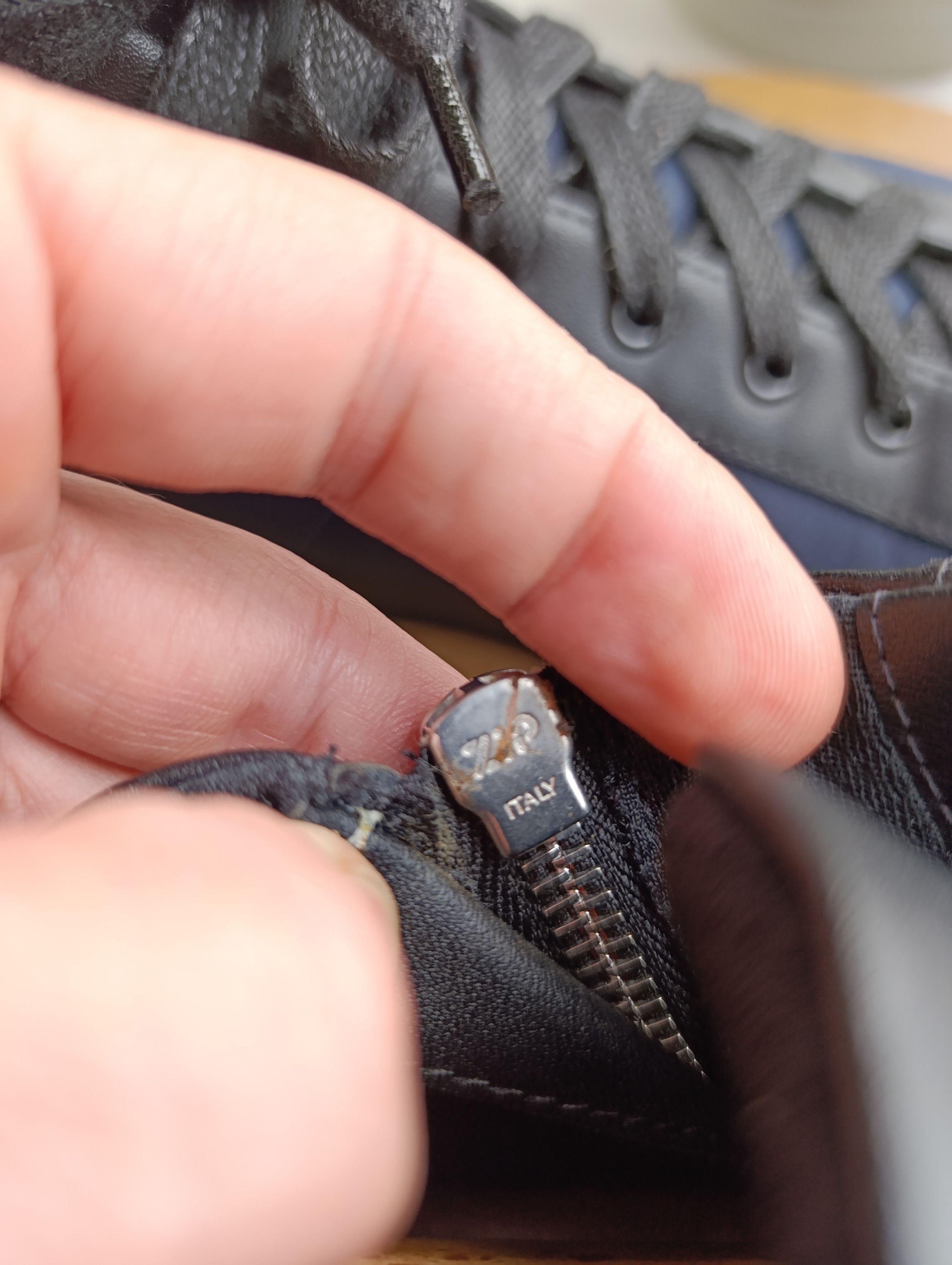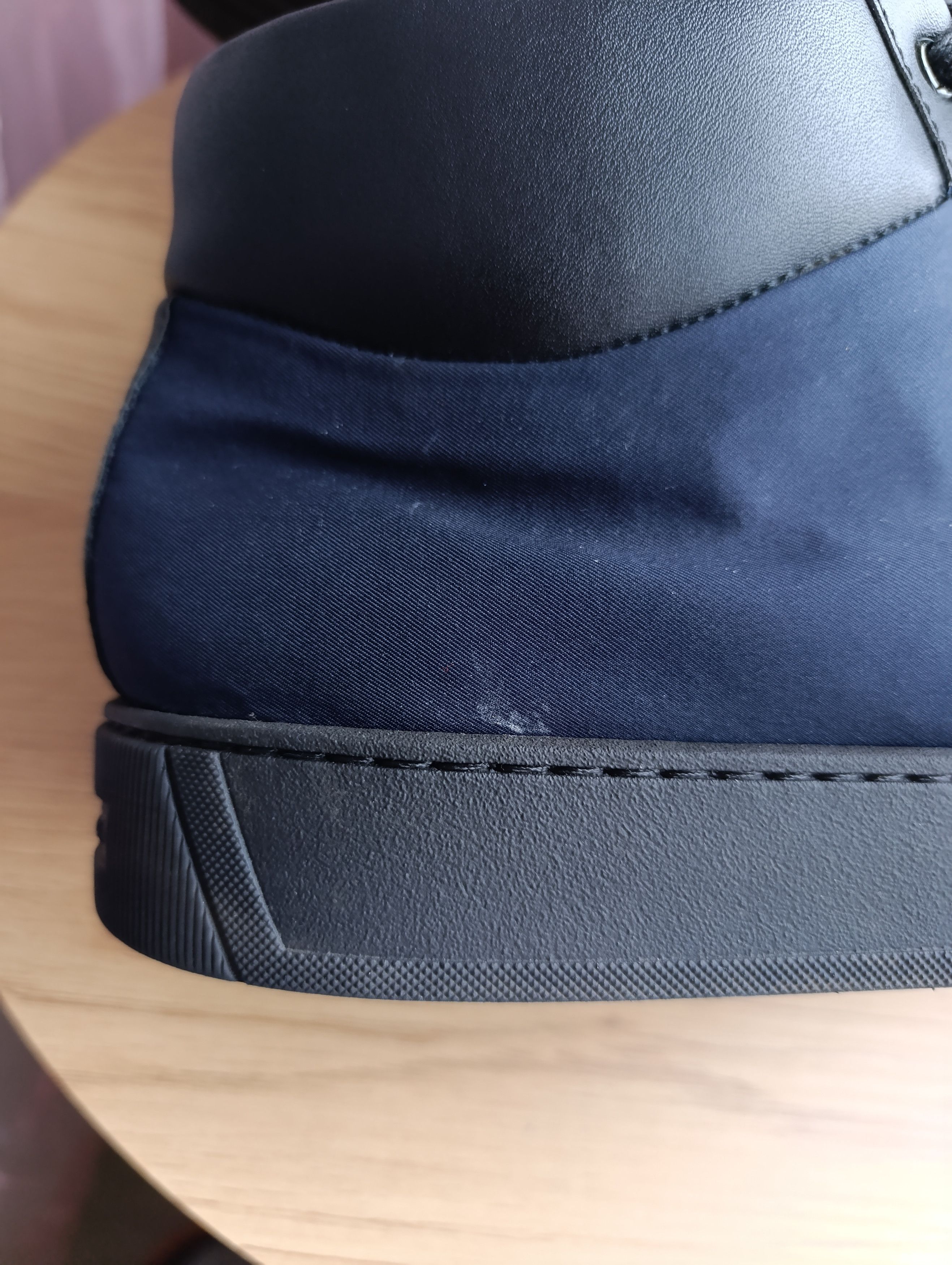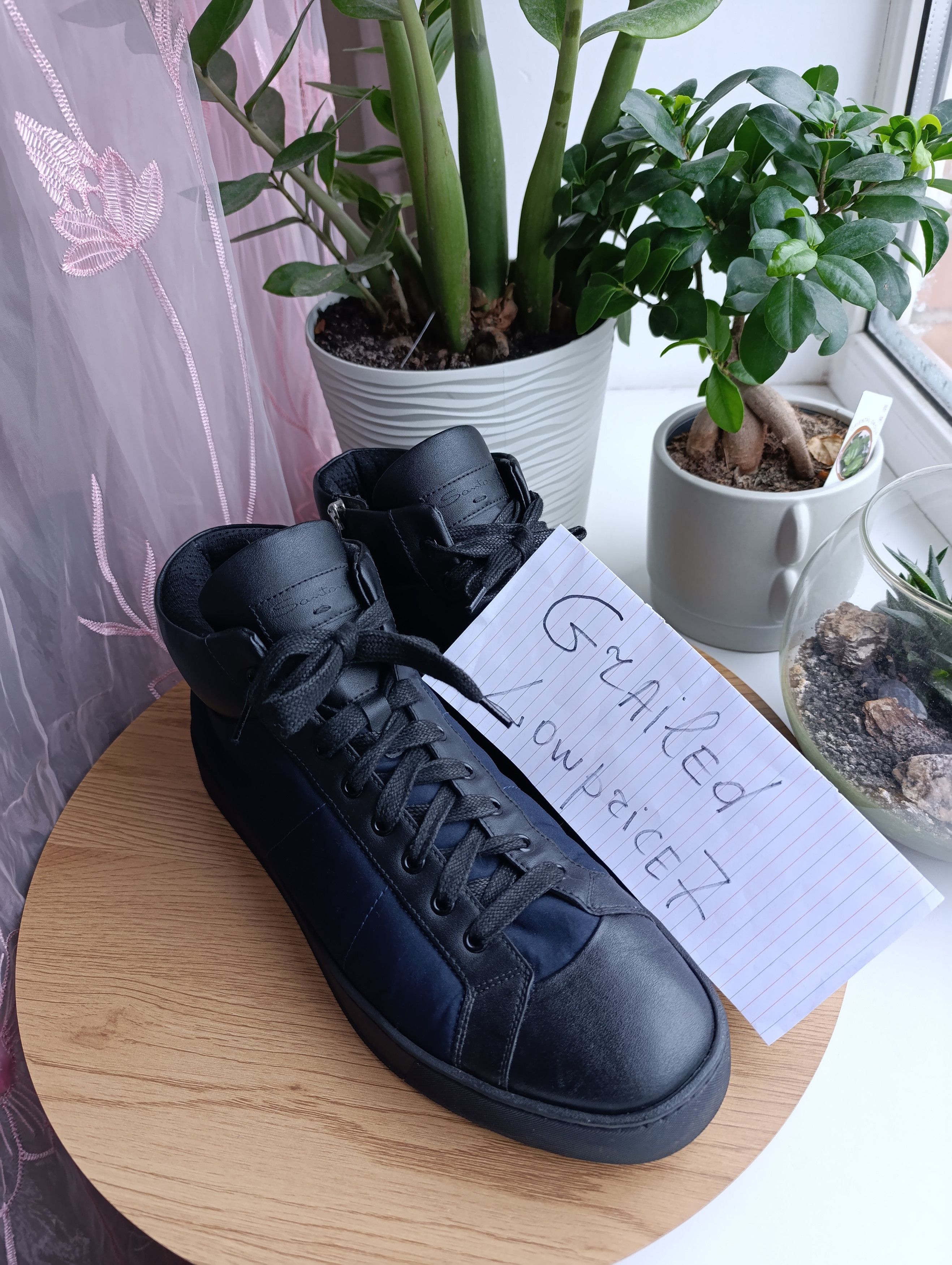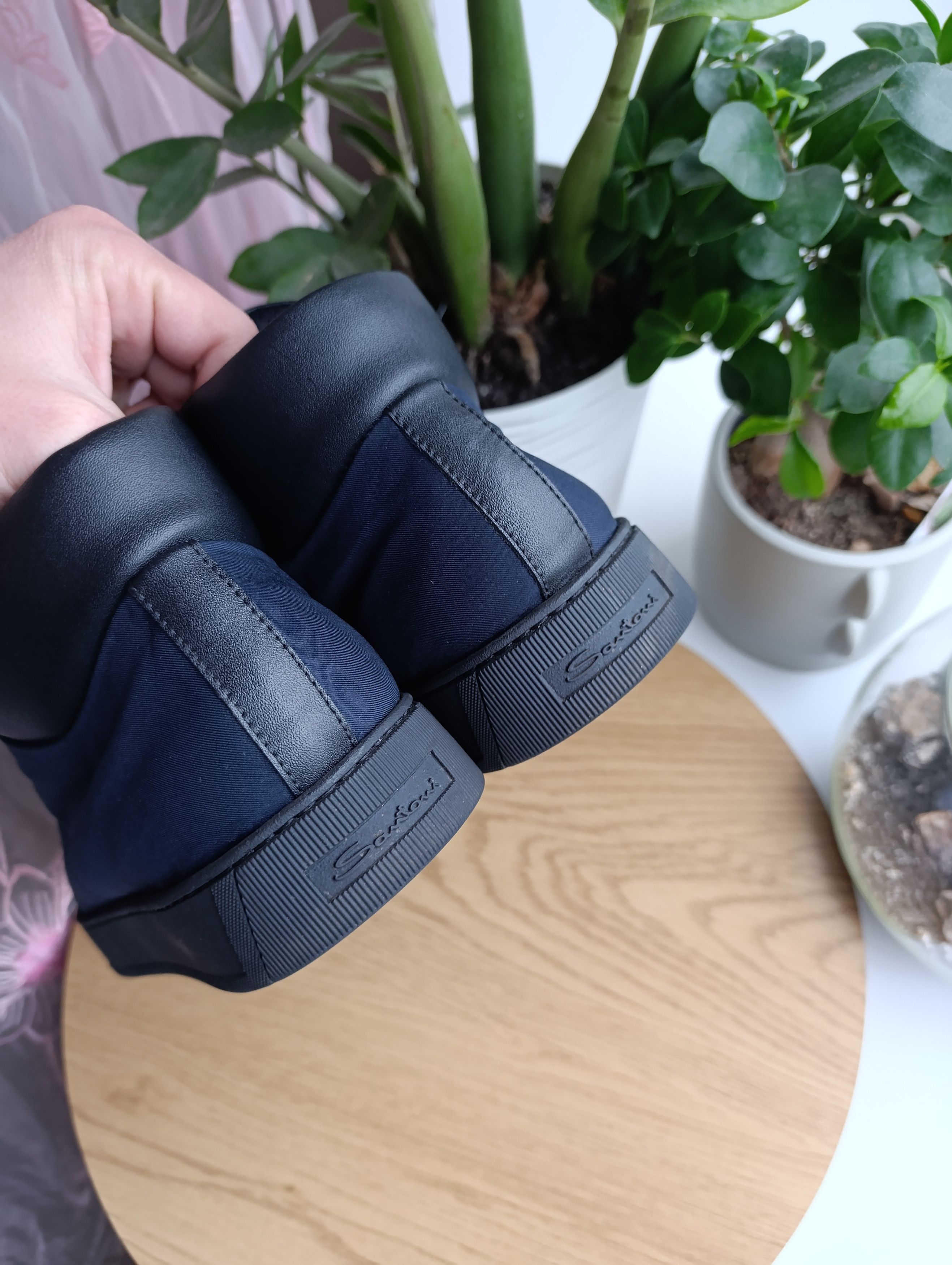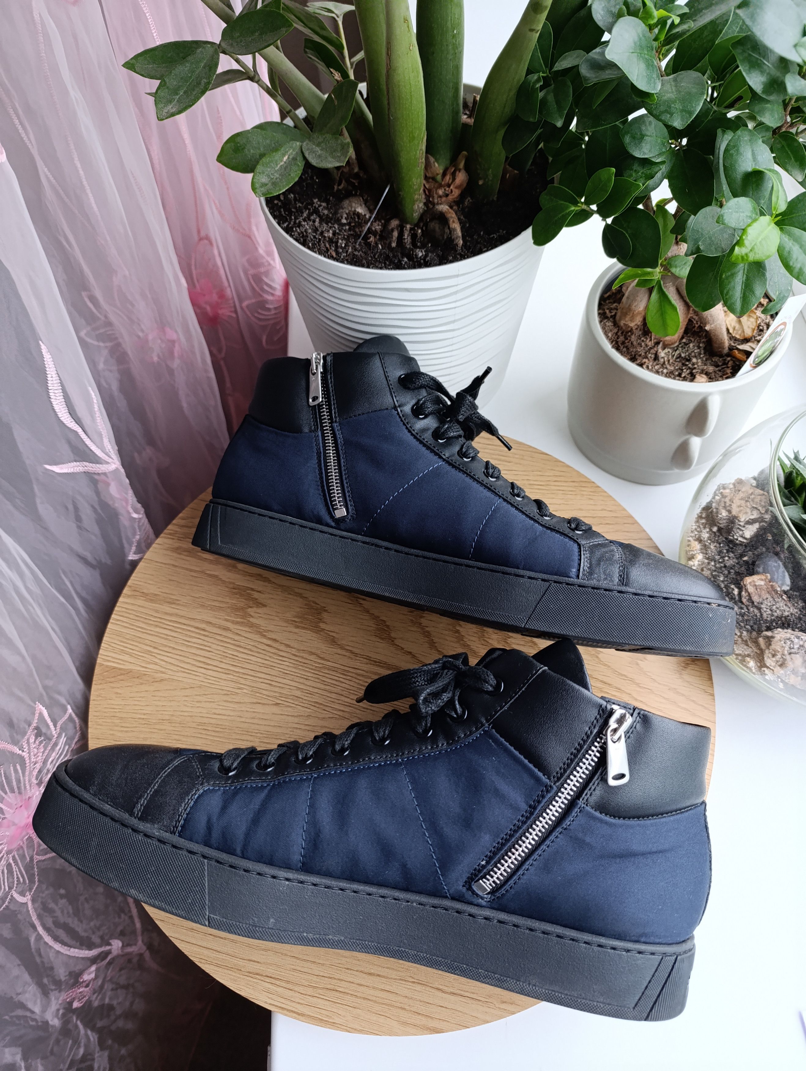 Men's high-top sneakers made of genuine soft leather and textiles from Santoni. High premium quality, side zipper for convenience. Size is UK12 US13. Excellent condition, but no insoles.