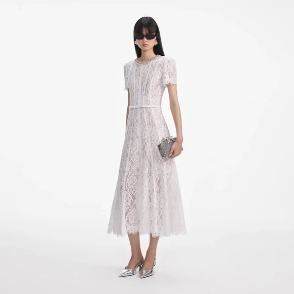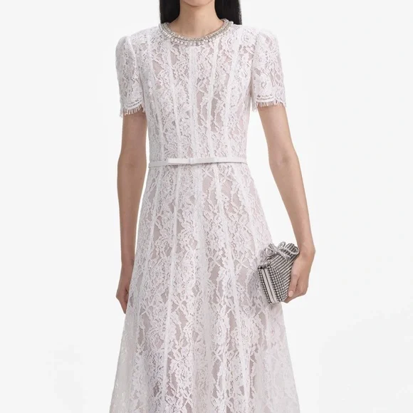 Shipping day will be same day or very next day!The dress is so much more beautiful than pictures and model wears!There's no belt included originally. Positively angelic in pristine white lace, this dress marries our signature fabric with a timeless silhouette. Show off its diamanté trimmed neckline with a pair of our statement earrings.- Fitted style, take one size up if between sizes- This style has minimal stretch- Concealed zip closure at back- Detachable cami lining- Diamanté embellishments- Model is 5ft10/178cm and wears a size 8/ us 4.Main Fabric 1: Ground Fabric: 44% Viscose31% Cotton 25% Polyamide Yarn 1: Polyamide Yarn 2: Polyester (Exclusive Of Decorative Sequins) Main Fabric 2: 100% Polyester Lining: 100% Polyester.